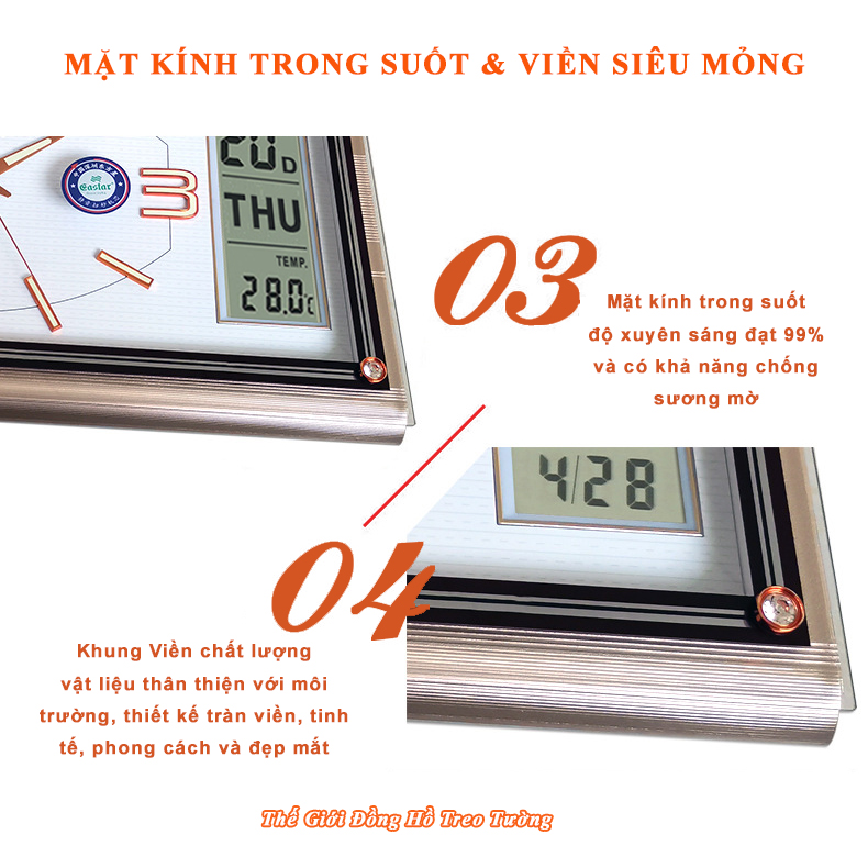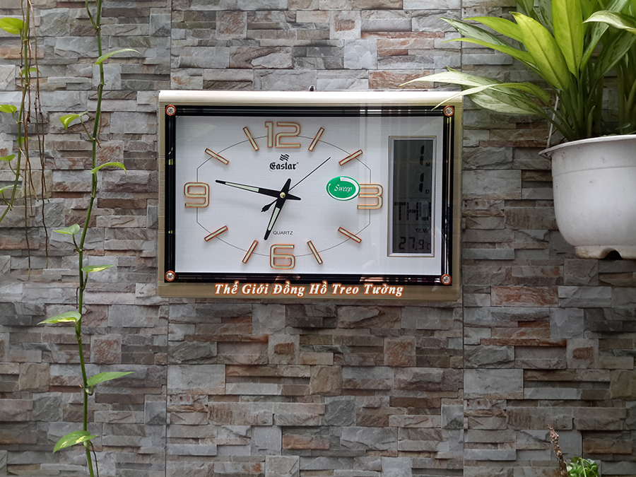 - Đồng Hồ Treo Tường Cao Cấp EASTAR Kim điện tử, Dạ quang, Đồng hồ Lịch Vạn Niên và Nhiệt kế hình Chữ nhật, Mặt kính Nổi, hiện đại, sang trọng.