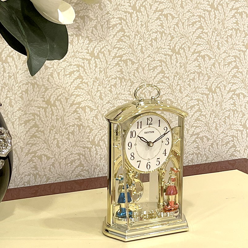 Đồng hồ để bàn Nhật Bản Rhythm 4RP796WS18, dùng pin (AAx2), vỏ nhựa cao cấp mạ vàng kết hợp mica trong suốt nhìn xuyên thấu, Kích thước 14.0 x 22.8 x 8.3cm, trọng lượng 390g. Quả lắc có hoa văn bắt mắt. Máy Rhythm chính xác, cực êm không phát tiếng tíc tắc gây khó chịu.