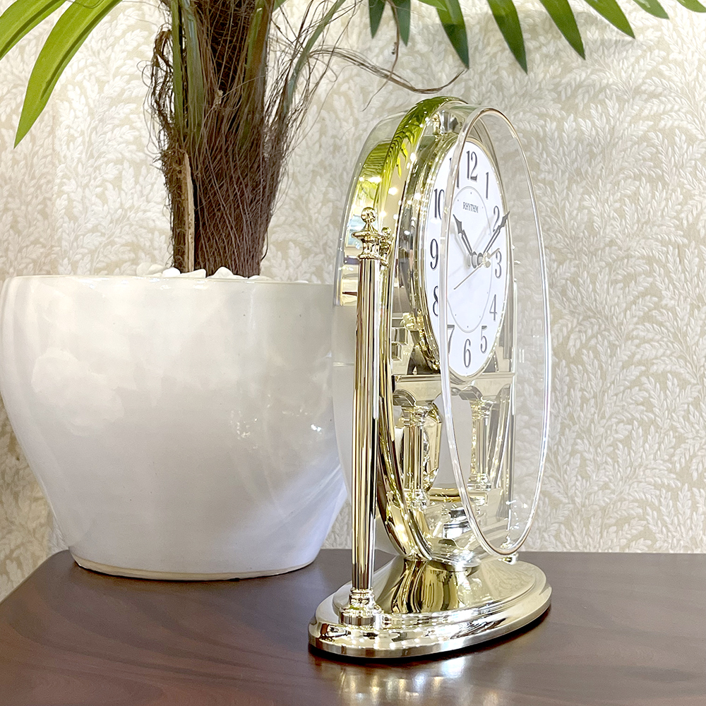 Đồng hồ để bàn Nhật Bản Rhythm 4RP796WS18, dùng pin (AAx2), vỏ nhựa cao cấp mạ vàng kết hợp mica trong suốt nhìn xuyên thấu, Kích thước 14.0 x 22.8 x 8.3cm, trọng lượng 390g. Quả