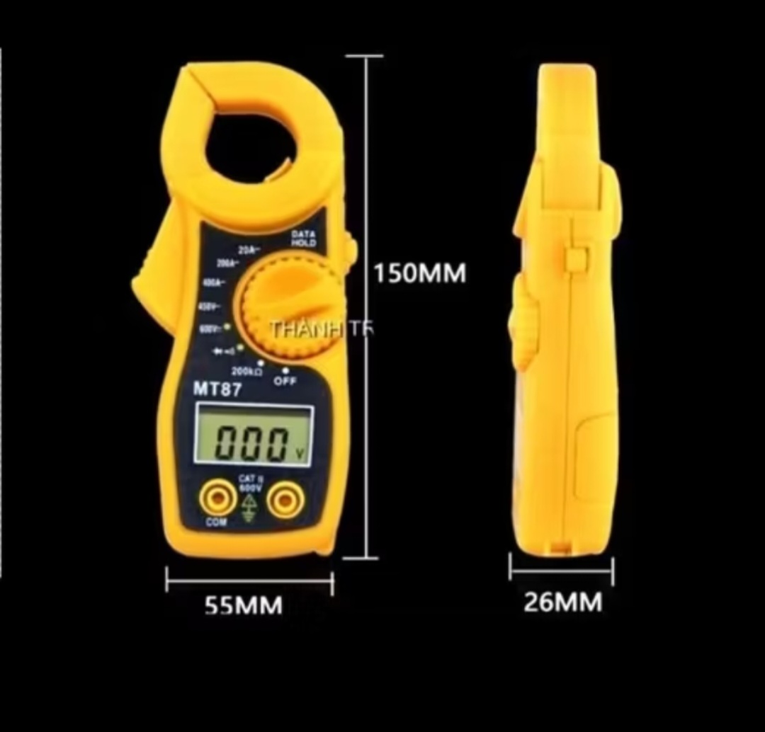 - Màu sắc thân: màu vàng, đỏ, xanh dương Hướng dẫn sử dụng Đồng hồ kẹp dòng MT87 (Ampe kìm MT87): Đo dòng điện xoay chiều ( ampe kìm chỉ đo được dòng xoay chiều thôi ) : chuyển công tắc về nấc A ( có 3 nấc A đó là 20A~ , 200A~, 400A~) tùy vào dự đoán mà chọn các nấc cho hợp lý nhé. Nếu kết quả hiển thị trên LCD là 1 tức là dòng điện có cường độ lớn hơn nấc chọn. Chúng ta chuyển sang nấc đo cao hơn. Cách đo: Kẹp kìm vào 1 sợi dây cần đo dòng điện chạy qua nó . Lưu ý chỉ kẹp vào 1 sợi thôi nhé Đo hiệu điện thế: Sử dụng 2 que đo. Cắm 2 que đo vào 2 lỗ trên đồng hồ , chuyển công tắc về nấc 600V~– ( Đo được hiệu điện thế dòng 1 chiều và xoay chiều) chọc 2 đầu que đo vào 2 cực của nguồn điện cần đo. Đo điện trở: thì chuyển công tắc về nấc 200KOhm , chọc 2 đầu que vào 2 đầu điện trở cần đo và đọc kết quả. Kiểm tra thông mạch: Dùng 2 que đo chọc vào vị trí 2 tiếp điểm cần xác định xem có thông mạch hay không. Nếu thông mạch thì sẽ có tiếng bíp. Sản phẩm này là tài sản cá nhân được bán bởi Nhà Bán Hàng Cá Nhân và không thuộc đối tượng phải chịu thuế GTGT. Do đó hoá đơn VAT không được cung cấp trong trường hợp này.