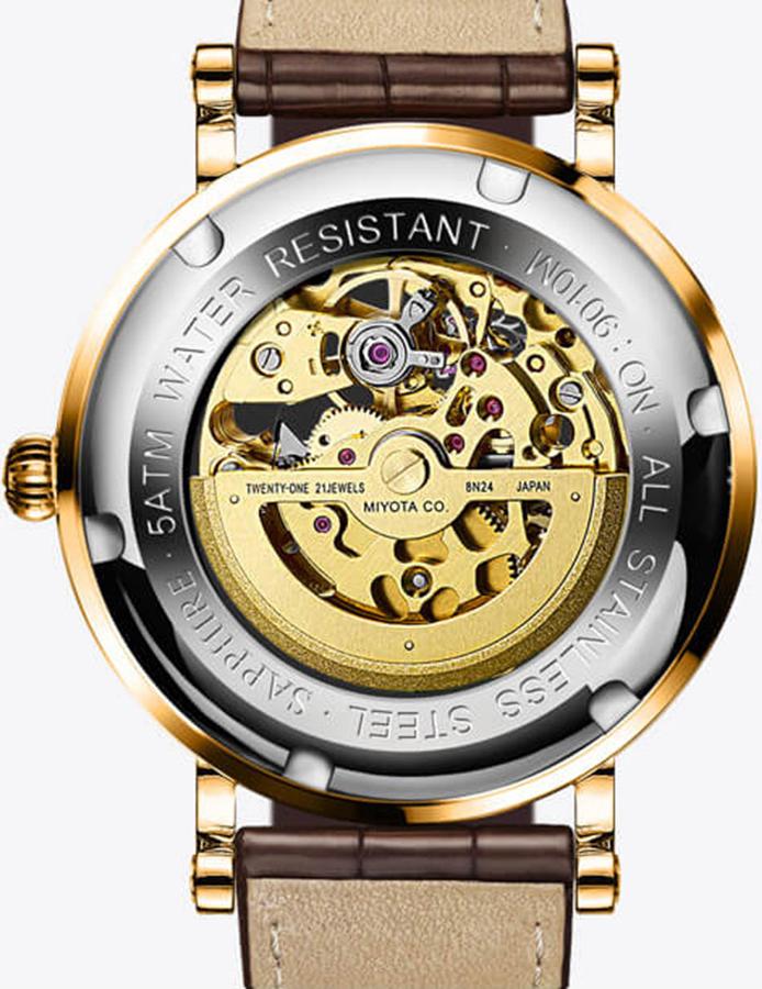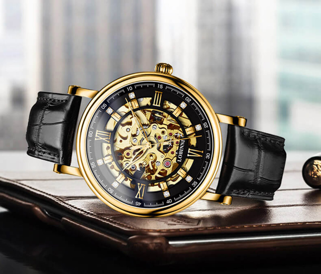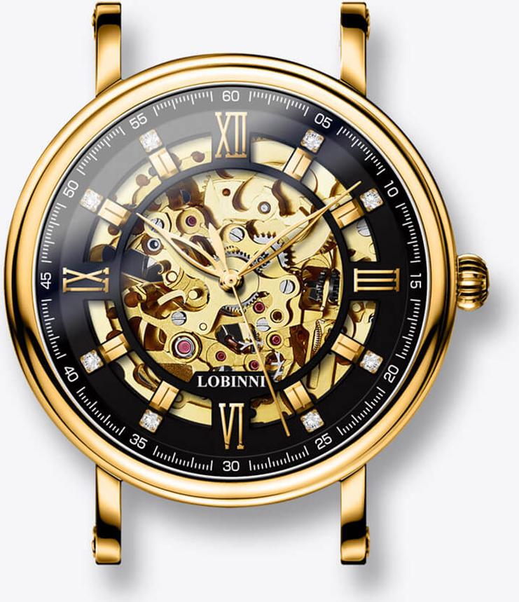 ❏ Vàng hồng 18K: Là vàng nguyên khối, phủ trọn gần như là toàn bộ mặt số đồng hồ LOBINNI L9010. Trong khi đó, sự sang trọng lại được kết hợp với nền tảng Skeleton độc đáo, giúp các quý ông chìm đắm ở cả mặt trước lẫn mặt sau thiết kế.