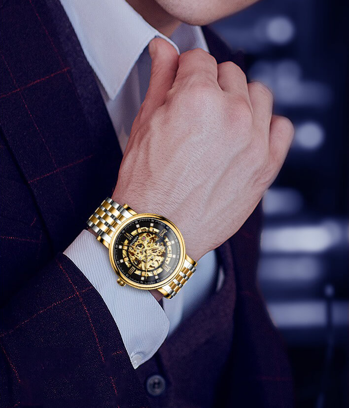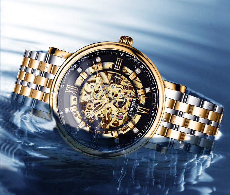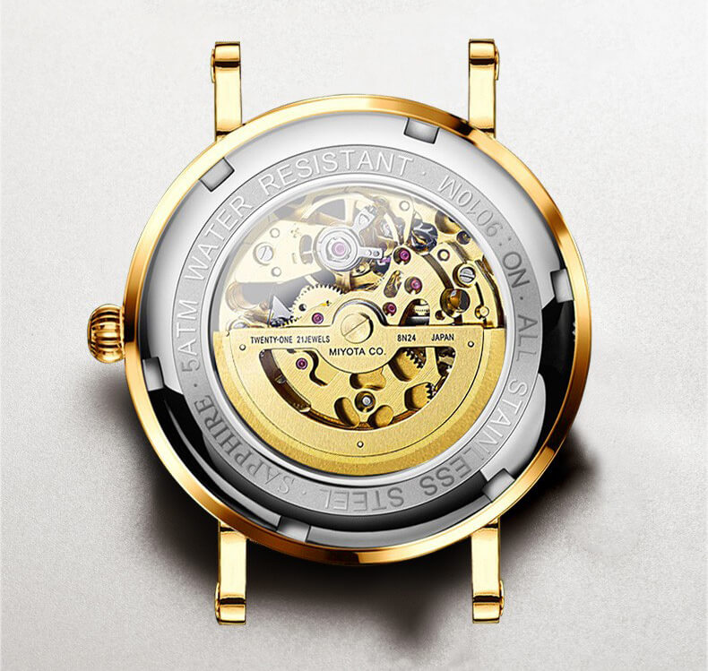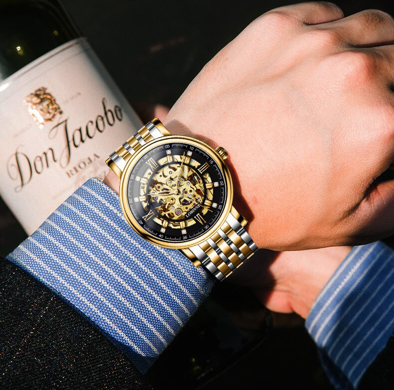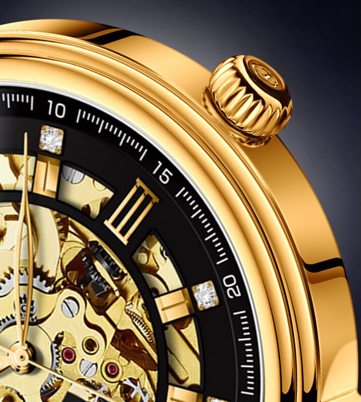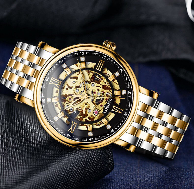 ❏ Vàng hồng 18K: Là vàng nguyên khối, phủ trọn gần như là toàn bộ mặt số đồng hồ LOBINNI L9010. Trong khi đó, sự sang trọng lại được kết hợp với nền tảng Skeleton độc đáo, giúp các quý ông chìm đắm ở cả mặt trước lẫn mặt sau thiết kế.