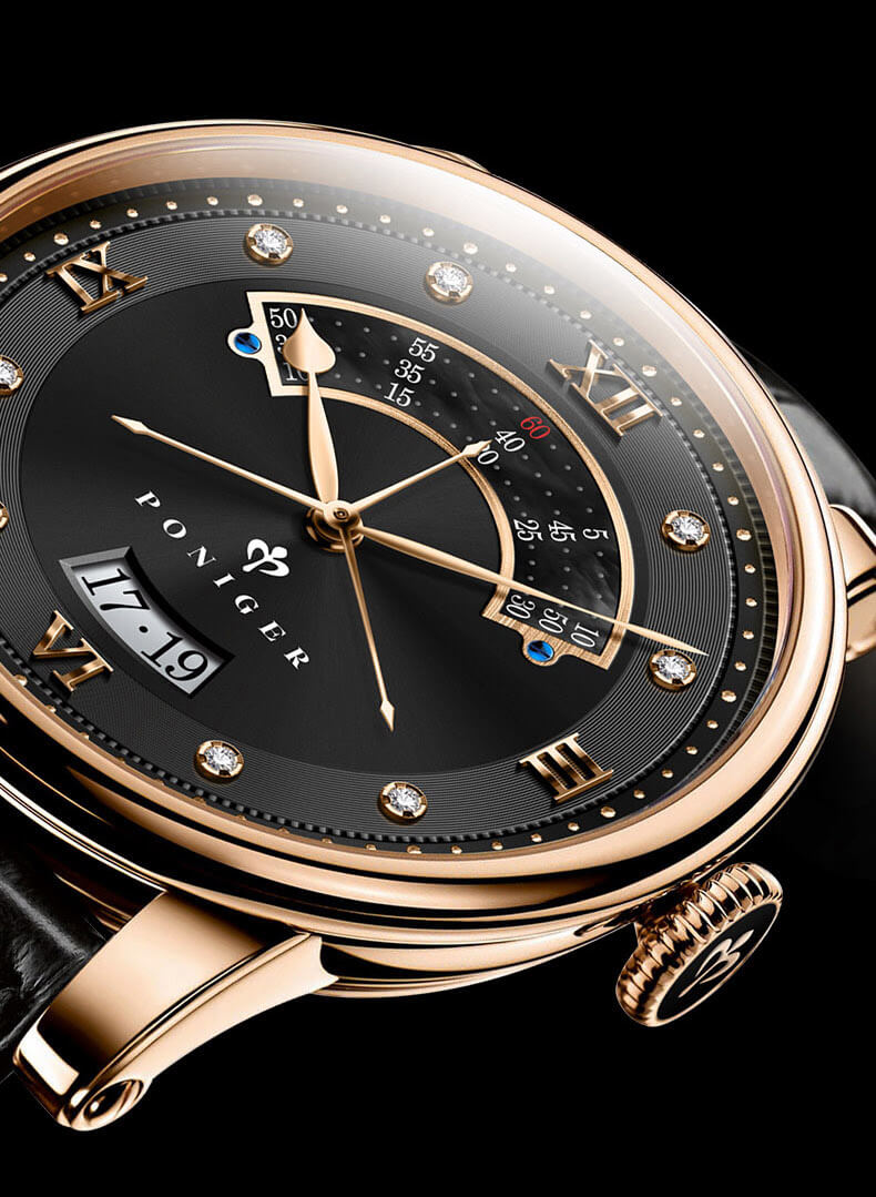 Đồng hồ Thụy Sĩ luôn mang lại cho người dùng một khoái cảm đặc biệt về cả diện mạo lẫn chất lượng. Như chiếc Poniger này, đẳng cấp thể hiện qua dòng chữ "SWISS MADE" được in trên mặt số. Bên cạnh đó còn là: