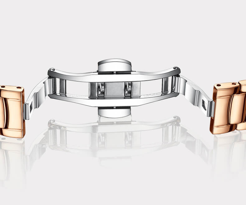 Thông số kỹ thuật - Chốt gập ba - Dây đeo bằng thép không gỉ - Mặt kính khoáng - Chống nước - Giờ hiện hành thông thường - Đồng hồ kim: 3 kim (giờ,