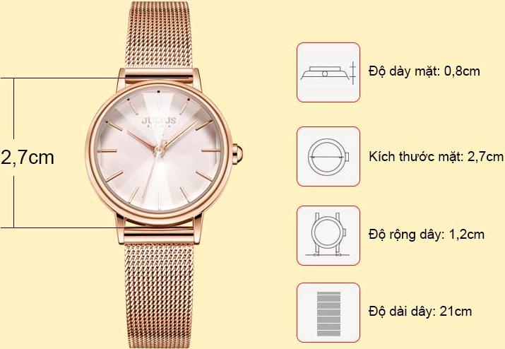 Mua tại TiktokThương hiệu: JULIUS. Mã sản phẩm: JA-1120 Dành cho: Nữ giới, yêu thích thời trang và phá cách Chất liệu dây: Dây thép không gỉ Chất liệu mặt kính: Mặt kính khoáng cao cấp trong suốt rõ nét, độ cứng cao (chống va đập tốt ở mức sinh hoạt hàng ngày) Kích thước bề mặt: 2,7cm (Mặt tròn) Độ dày: 0,8cm Tổng độ dài : 21cm Độ rộng của dây: 1,2cm Kiểu khóa: Nút gài Chất liệu vỏ máy: Hợp kim mạ ion bạc, sử dụng công nghệ mạ IP chân không tiên tiến giúp đem lại độ sáng bóng và bền màu Máy: Quartz Nhật MIYOTA 2035 (thuộc tập đoàn Citizen Nhật Bản) Khả năng chịu nước: Chống thấm nước 3ATM (30m) có thể đi mưa, rửa tay, rửa mặt. Tránh tiếp xúc với môi trường hóa chất như giặt đồ, tấm gội.