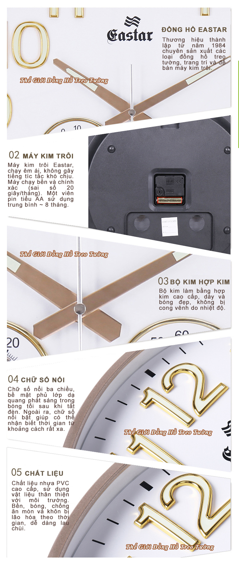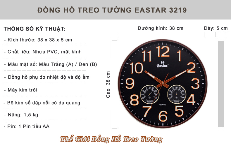 (*) Nhiệt ẩm kế tự động sử dụng nguyên lý co dãn của lò so kim loại dựa trên điều kiện thời tiết để hiển thị nhiệt độ và độ ẩm xung quanh nơi treo đồng hồ. Không nên sử dụng cho mục đích khác. Đây cũng không phải là dụng cụ nhiệt ẩm kế chuyên dụng. Mức sai số của Nhiệt kế là ± 2oC. Mức sai số của Ẩm kế là ± 10%.