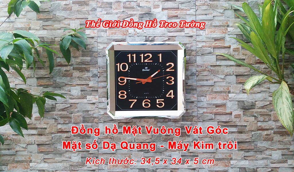 • Đồng hồ Treo tường Cao Cấp EASTAR KIM TRÔI NHẬT có Dạ quang (*), mặt vuông vát góc, kích thước 34,5 x 34, dày 5 cm.