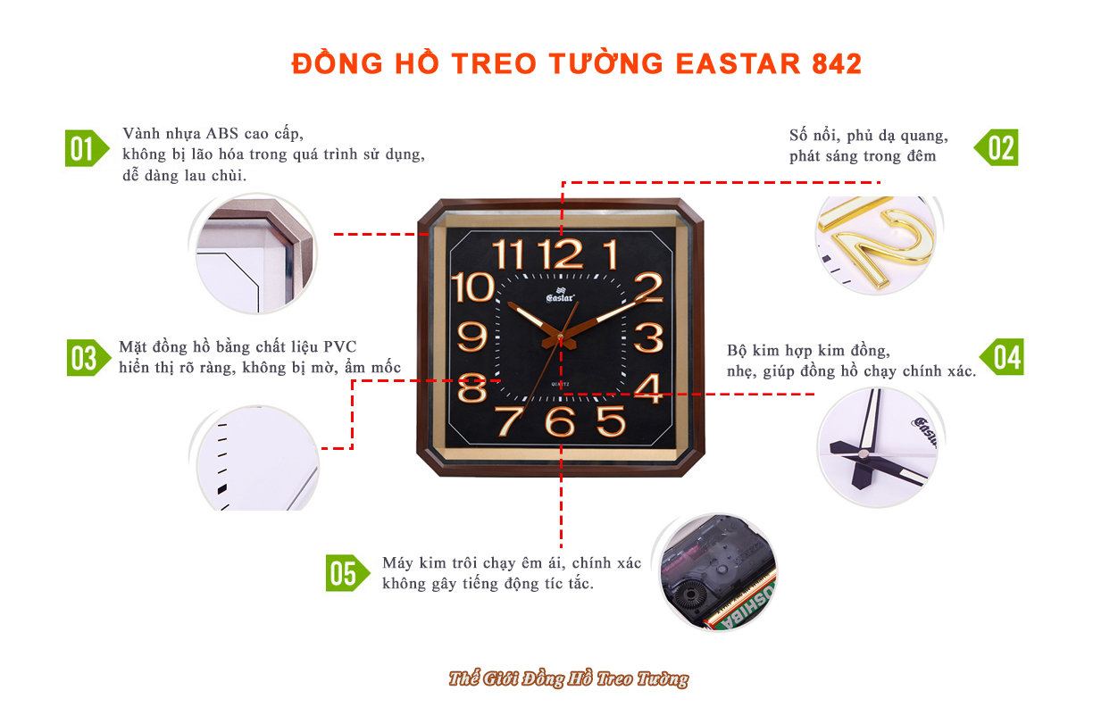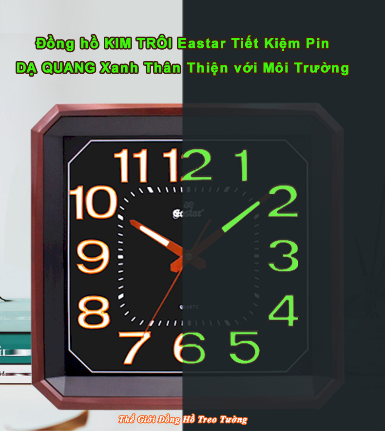 1. ĐẶC ĐIỂM NỔI BẬT: - Đồng hồ Treo tường Cao Cấp EASTAR KIM TRÔI NHẬT có Dạ quang (*), mặt vuông vát góc, kích thước 34,5 x 34, dày 5 cm. - Kiểu dáng