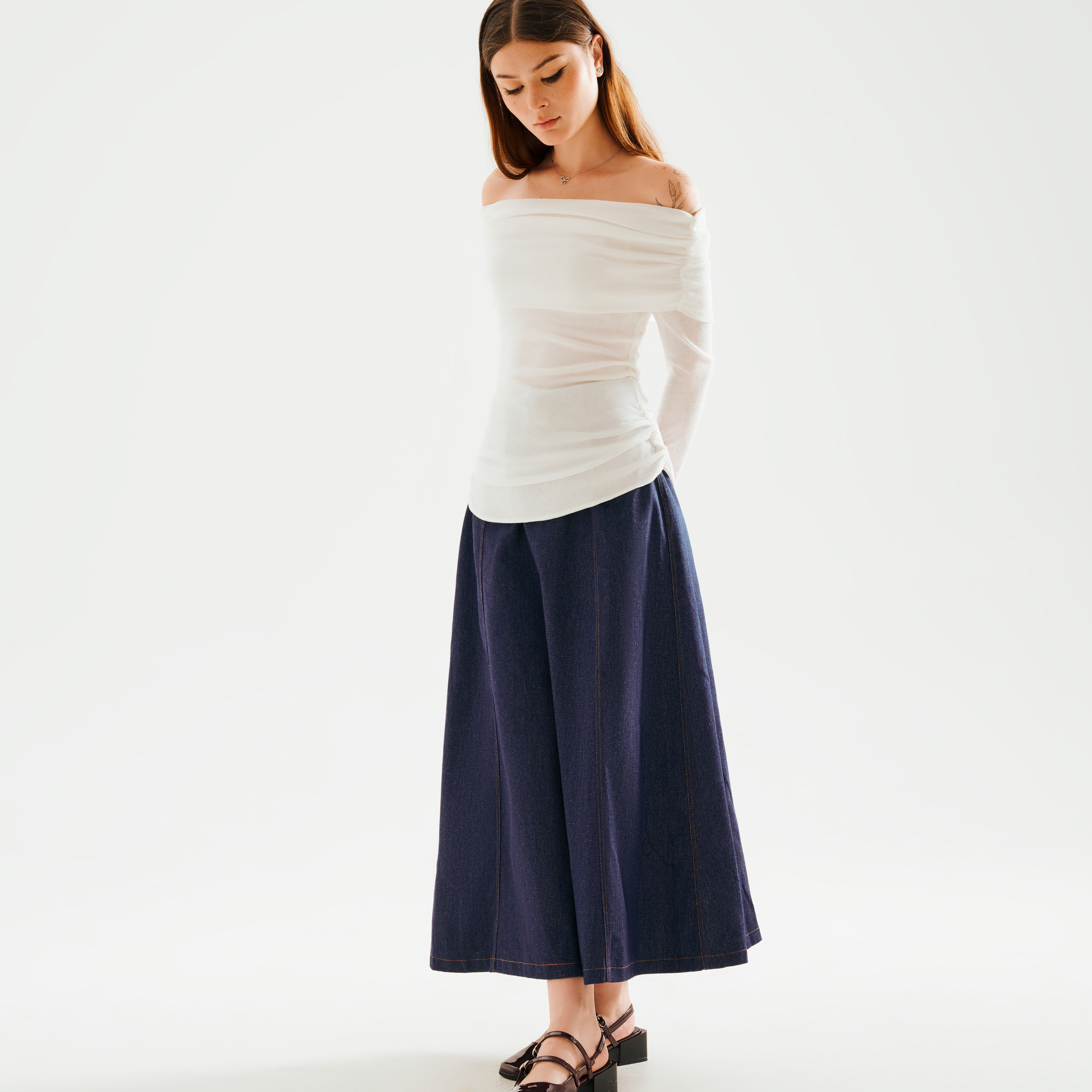 CHI TIẾT SẢN PHẨM - Sản phẩm : Áo nữ tay ngắn kiểu trễ vai chất liệu thích hợp mùa hè Muriel Miều Est.2013 - Chất liệu : Thun Cát - Màu sắc : KEM
