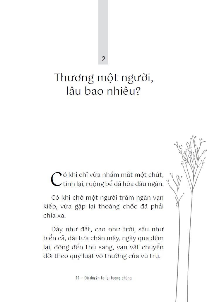 “Đủ duyên ta lại tương phùng” là cuốn sách ghi lại những trải nghiệm và rung cảm đẹp đẽ của tác giả trong quãng thời gian tu học tại đảo quốc Sri Lanka. Mỗi bài viết là một chiêm nghiệm đầy triết lý về các khía cạnh cuộc sống, với nền tảng là chữ “duyên”. Duyên vốn là một giáo lý quan trọng của nhà Phật và thuận theo nhân duyên cũng là một loại trí tuệ. Trong tương giao của muôn vật, muôn người đều tồn tại chữ duyên mà nếu không đủ trong sáng và từ bi, người đời dễ dàng vướng mắc và khổ lụy.