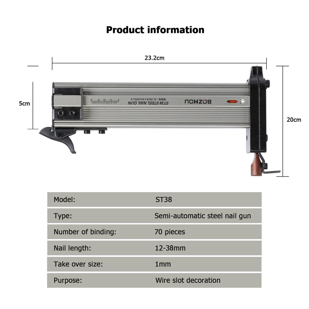 Mô hình: Máy đóng đinh bằng tay ST18 Kiểu: máy đóng đinh thép bán tự động Số lượng ràng buộc: 100 miếng Chiều dài móng: 12-18mm Tiếp quản kích thước: 8mm Chiều dài: 207mm Chiều dài dụng cụ: 207cm Mô hình: máy đóng đinh tự động bật lại ST18B Kiểu: máy đóng đinh thép bán tự động Số lượng ràng buộc: 100 miếng Chiều dài móng: 10-30mm Tiếp quản kích thước: 8mm Chiều dài: 207mm Mô hình: ST38 Kiểu: máy đóng đinh thép bán tự động Số lượng ràng buộc: 70 miếng Chiều dài móng: 12-38mm Tiếp quản kích thước: 1mm