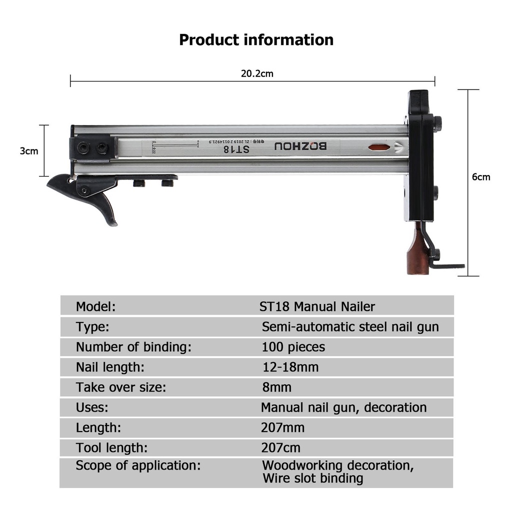 Mô hình: Máy đóng đinh bằng tay ST18 Kiểu: máy đóng đinh thép bán tự động Số lượng ràng buộc: 100 miếng Chiều dài móng: 12-18mm Tiếp quản kích thước: 8mm Chiều dài: 207mm Chiều
