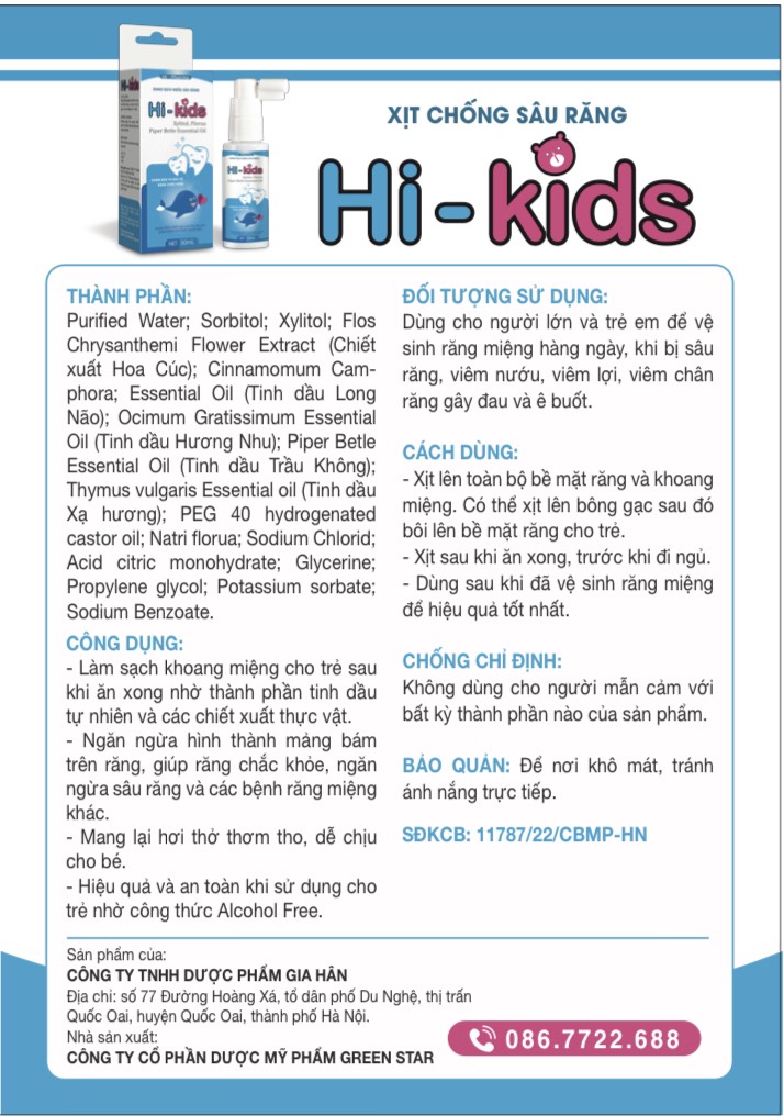 Mua tại TiktokThông tin chung (gốc) Xịt chống sâu răng Hi- Kids với công thức tối ưu mang lại hiệu quả cao. Thành phần : Xylitol, Flos Chrysanthe-mi Flower Extract ( Chiết xuất hoa cúc ) ; Cinnamomum Camphora; Essential Oil ( Tinh dầu Long não ) Ocimum Gratissimum Essential Oil ( Tinh dầu hương nhu); Piper bettle Essential Oil ( tinh dầu lá trầu không ) ; Thymus vulgaris Essential oil ( tinh dầu xạ hương ) ; PEG 40 hydrogenated castor oil; Natri florua ; Sodium chlorid; acid citric monohydrate; Glycerin; Propylene Sản phẩm được nghiên cứu chuyên sâu , có tác dụng hữu dụng, rất dể sử dụng cho trẻ nhỏ . Đặc biệt với sự kết hợp của Xylitol, Florua và chiết xuất từ lá trầu không , giúp sát khuẩn , ức chế virus gây hại cho răng miệng . Chỉ định