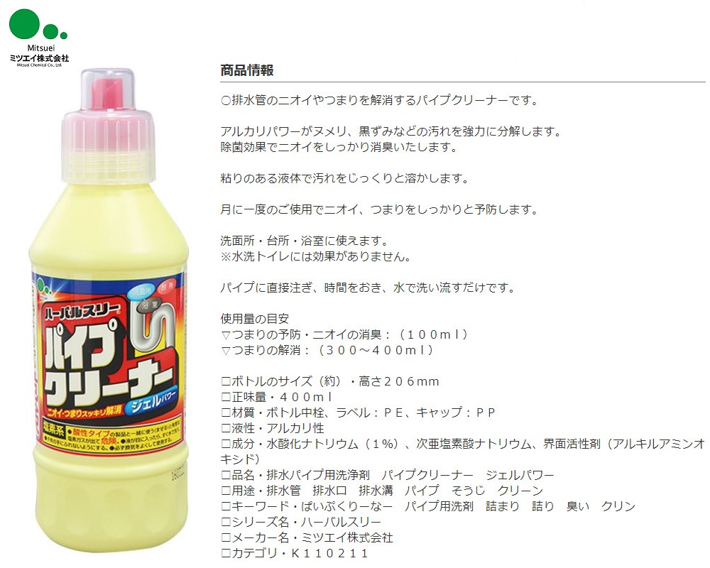 Dung dịch thông tắc đường ống cực mạnh Mitsuei, tiêu diệt tận gốc các loại vi khuẩn và chất cặn bẩn, mùi hôi thối -nội địa Nhật Bản Chất liệu: Sodium hydroxide (1%), sodium hypochlorite,
