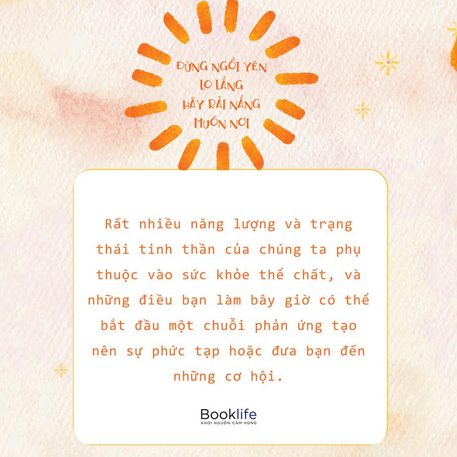 Thông qua cuốn sách giàu cảm hứng Đừng ngồi yên lo lắng, hãy rải nắng muôn nơi của mình, biên tập viên Meaghan B Murphy sẽ chia sẽ tới bạn đọc những bí quyết tìm kiếm những niềm vui sống quý giá mỗi ngày.