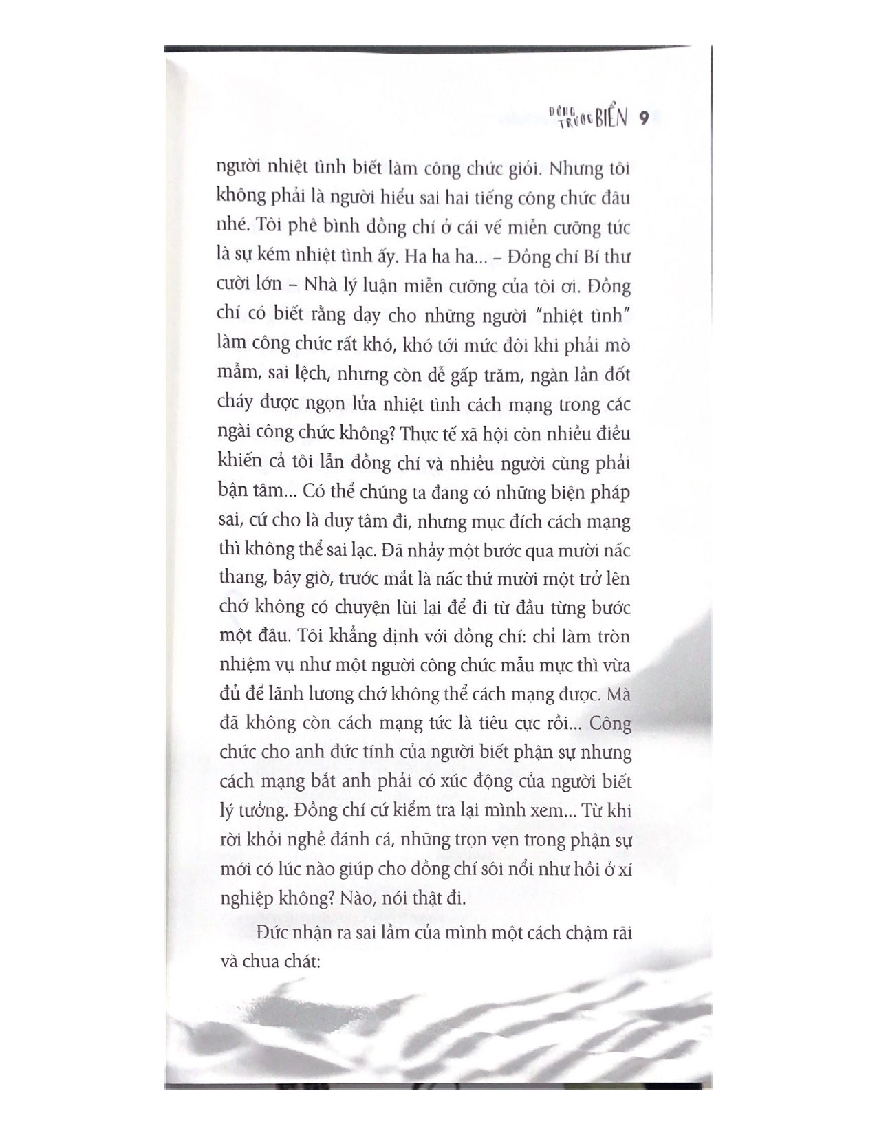 'Những bất mãn của người phụ nữ bình dị mà ông vẫn chủ quan coi thuộc loại em út đã vô hình trung thành chấn động so sánh vào chính ông. Những bày tỏ ở Út đang là nỗi bất bình khẩn thiết, nỗi lo toan cụ thể, thật sự của người trong cuộc, đang đau vết đau của tập thể bằng nỗi đau của chính mình. Còn ông, quả thật đang ở “trên cao”. Ông quan tâm đến tình trạng xã hội trên cơ sở triết lý với những phân giải và trách nhiệm khô khan, không cảm xúc. Nghe đề nghị của đồng chí Bí thư Thành ủy, ông nóng hổi trong người bởi sự kiện quan hệ mang tính bất ngờ và ân nghĩa chứ chưa có thật lớn, thật nhiều, ý thức trách nhiệm mới nặng nề, cấp bách và sự trở về với niềm ham say nghề nghiệp, một thời từng khát vọng, sôi sục trong mình.