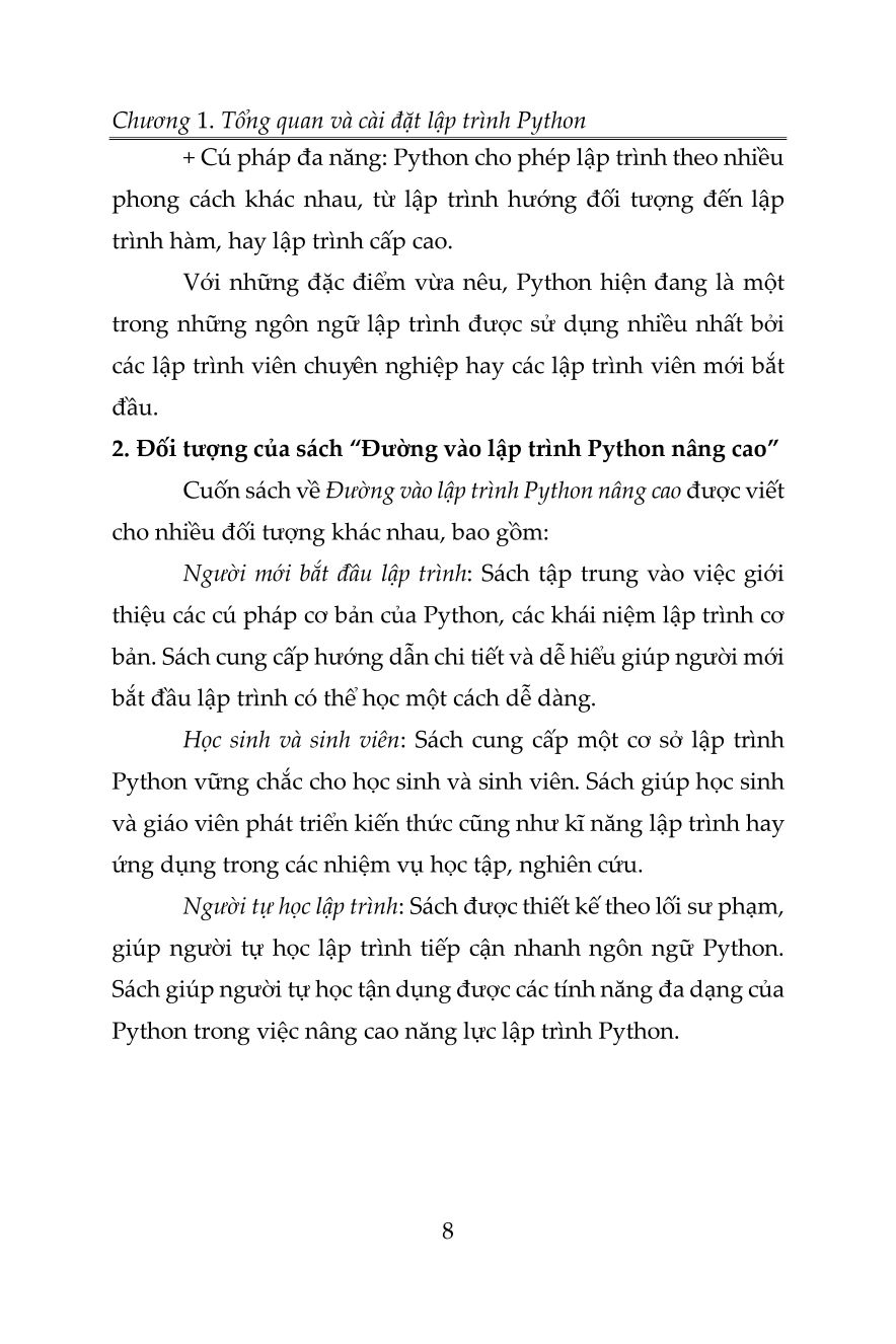 Cuốn sách được viết chủ yếu cho đối tượng học sinh lớp 10, 11, 12, sinh viên ngành Khoa học máy tính, Kĩ thuật máy tính, Công nghệ thông tin, giáo viên và các nhà nghiên cứu về Python. Những ai quan tâm đến lập trình Python đều có thể tìm thấy nhiều kiến thức bổ ích trong cuốn sách.