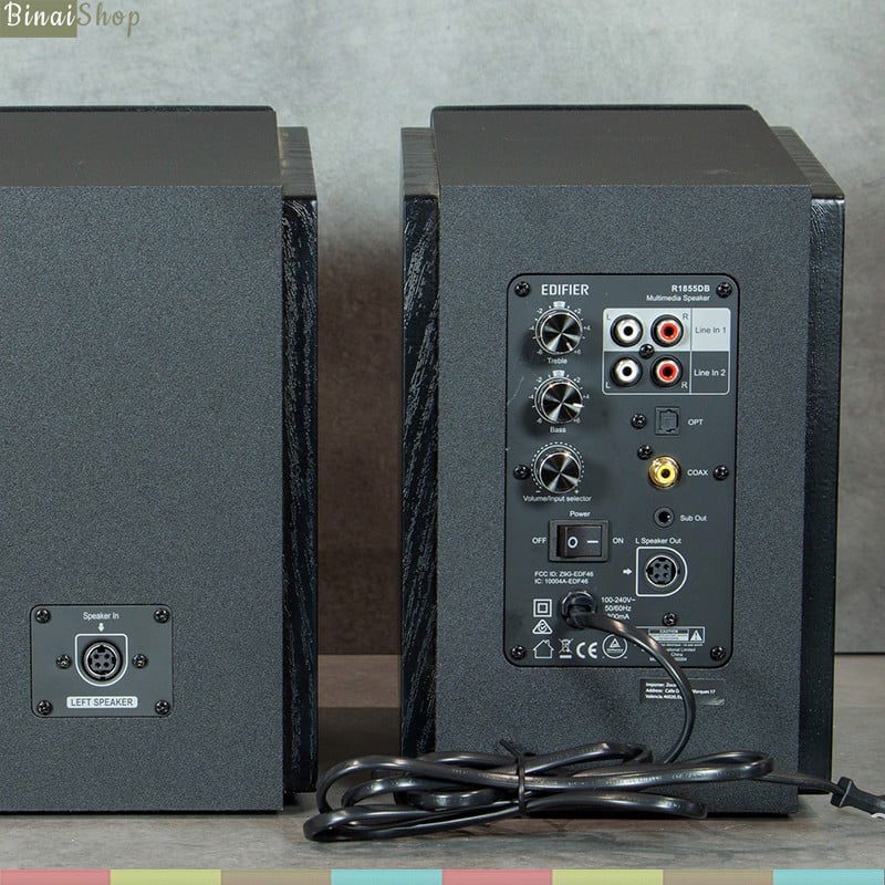 - Sách hướng dẫn THÔNG SỐ KỸ THUẬT Total Power Output 19Wx2 + 16Wx2 (RMS) Frequency Response 60Hz - 20kHz Signal-to-Noise Ratio ≥ 80dB (A) THD + N ≤0.2% Tweeter Unit Φ19mm silk diaphragm, 6 ohm Mid-Bass Unit 4inch (116mm) nomex diaphragm, 6 ohm Audio Inputs Bluetooth, Line In, Optical, Coaxial Audio Output Subwoofer output Input Sensitivity Line In 1: 400±50mV Line In 2: 600±50mV OTP: 350±50mFFS COAX: 350±50mFFS Bluetooth: 500±50mFFS Bluetooth Version V5.1 Dimension 155 x 254 x 223mm (W x H x D) Product Weight 7 kg Keyword: Edifier R1855DB, loa edifier, loa nghe nhạc, loa nghe nhạc cao cấp, loa nghe nhạc hay, loa nghe nhạc giá rẻ, loa máy tính, loa xem phim, loa xem phim nghe nhạc, loa xem phim giá rẻ, loa bookself, loa bluetooth