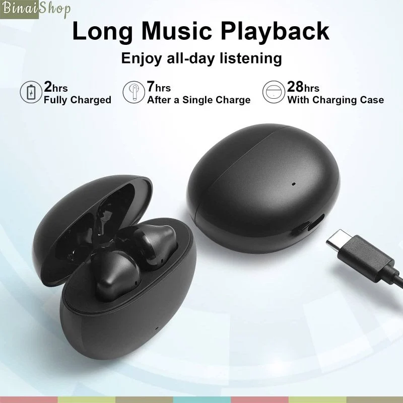 Trình điều khiển 6mm với cấu trúc 3 lớp giúp tăng cường đầu ra của âm bổng và âm trầm. Nhận ra âm thanh mạnh mẽ. Lên đến 5 giờ khi tai nghe được sạc