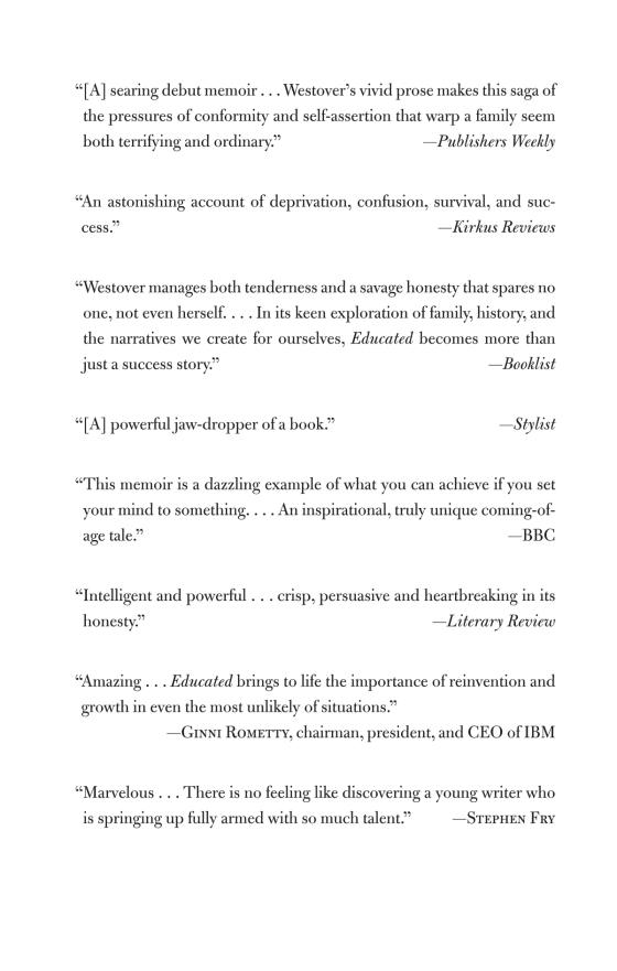 Educated: A Memoir #1 NEW YORK TIMES, WALL STREET JOURNAL, AND BOSTON GLOBE BESTSELLER - One of the most acclaimed books of our time: an unforgettable memoir about a young woman who, kept out of