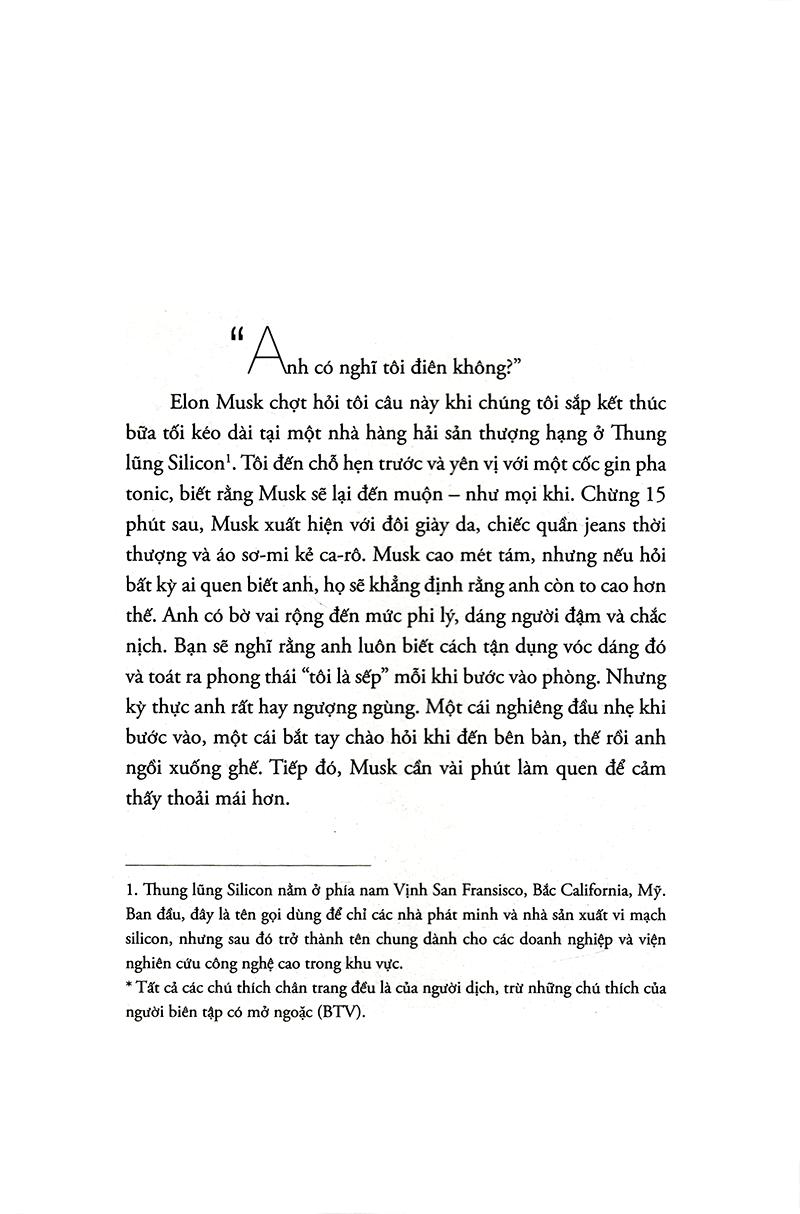 Vance dùng câu chuyện cuả Musk để khám phá một trong những câu hỏi trọng tâm trong thời đại của chúng ta: liệu quốc gia của những nhà phát minh sáng chế, thế lực đã dẫn dắt thế giới hiện đại suốt một thế kỷ có còn trụ nổi trong kỷ nguyên cạnh tranh toàn cầu khốc liệt? Anh khẳng định rằng Musk – một trong những nhận vật dị thường và ấn tượng nhất lịch sử kinh doanh Mỹ- là một sự hòa trộn đương đại của những nhà sáng chế huyền thoại và những nhà công nghiệp như Thomas Edison, Henry Ford, Howard Hughes và Steve Jobs. Hơn bất cứ doanh nhân nào khác, Musk cống hiến toàn bộ năng lượng và cược toàn bộ tương lai của anh cho việc kiến tạo một tương lai giàu mạnh và rộng mở cho thời hoàng kim của khoa học viễn tưởng