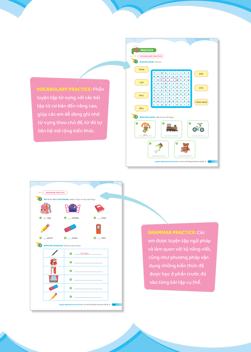 • Các bài luyện tập đa dạng với nhiều hình ảnh và màu sắc, giúp khơi cảm hứng học tập của các em. Với các chủ đề gần gũi, cấu trúc mỗi bài học chặt chẽ, bộ sách sẽ là một trợ thủ đắc lực giúp các em học sinh học tốt và giỏi tiếng Anh.