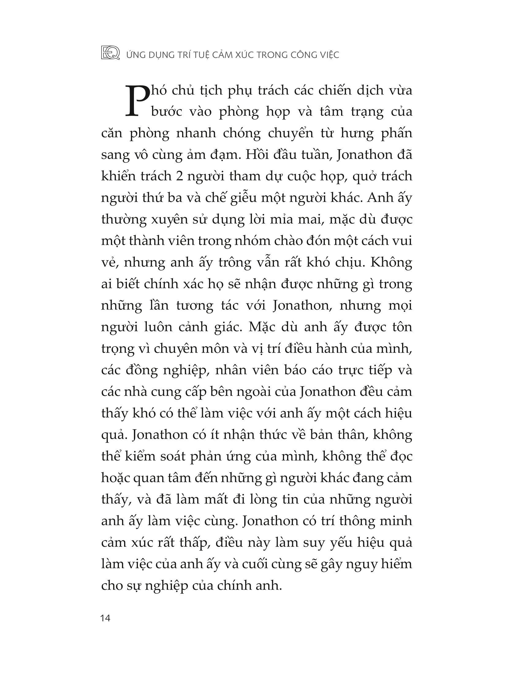Trí thông minh cảm xúc tối ưu chính là về cách bạn thể hiện trong các mối quan hệ. Điều này có nghĩa là biết bản thân nghĩ gì, cảm thấy gì và muốn gì ở bên trong, và bạn có thể điều chỉnh điều này để thể hiện nó ra bên ngoài như thế nào. Đó cũng là về khả năng khai thác những gì người khác có thể nghĩ, cảm nhận, mong muốn, và sử dụng kiến thức này để giúp bạn định hướng mối quan hệ của mình với họ. Đó là về danh tiếng, sự đáng tin cậy và sự đồng cảm mà bạn thể hiện ra bên ngoài. Đó là về hành vi của bạn khi giao tiếp và cộng tác với người khác, mức độ đưa ra và nhận phản hồi cũng như khả năng quản lý căng thẳng và xung đột của chính mình. Làm việc hiệu quả với những người bị ảnh hưởng sâu sắc bởi cảm xúc của bạn, và đòi hỏi khả năng xoa dịu, kết nối và hòa nhập trong các mối quan hệ. Khi EQ của bạn cao, nó có thể cải thiện đáng kể tính hiệu quả của bản thân với những người khác cũng như giúp chính mình thăng tiến trong sự nghiệp. EQ không thể được phát triển ngoài các tương tác với người khác vì nó thể hiện trong hành vi của bạn và điều này chỉ có thể được phát triển duy trì trong các mối quan hệ. Một phần những gì khám phá trong cuốn sách này sẽ có ích nếu bạn không chọn thực hành các yếu tố EQ lên các mối quan hệ của mình. Điều này có thể yêu cầu bạn phải vượt ra ngoài vùng thoải mái để thay đổi hành vi của mình. Nó sẽ cần sự can đảm và, giống như bất cứ điều gì đáng làm, nó có thể đem lại lợi ích khổng lồ.