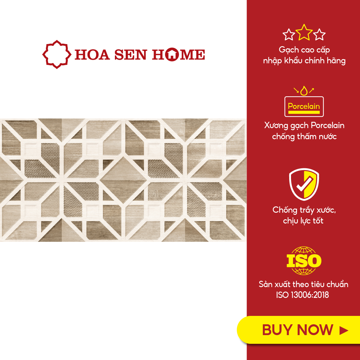 Hoạ tiết là sự kết hợp hài hòa giữa 3 màu be, nâu, trắng ngà và đen tạo nên một tone màu ấm áp, dịu nhẹ nhưng độ sáng vẫn vừa đủ để mang tính thoáng đãng cho căn phòng. Họa tiết là ngôi sao 8 cánh tối giản giúp tăng tính thẩm mỹ và sang trọng, phù hợp để ốp tường trang trí cho các không gian nhà tắm, nhà bếp, phòng khách, khu vực ngoại thất cùng với những loại gạch màu trơn để tạo sự tương phản và nổi bật thêm hoa văn.