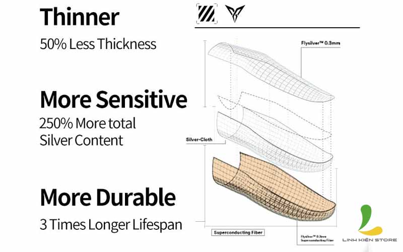 - Thao tác nhanh và mượt mà Đa phần găng tay chơi game trên thị trường chứa hàm lượng bạc rất ít (chỉ chiếm 4%). Điều này khiến kết cấu của chúng rời rạc và dễ hư hỏng form dáng. Ngược lại, Flydigi Sleeve P1 chiếm đến 14% hàm lượng bạc nên rất bền bĩ. Tăng tính chính xác và linh hoạt hơn khi bạn bấm vào những icon nhỏ trên màn hình. Hình ảnh dưới kính hiển vi quang học