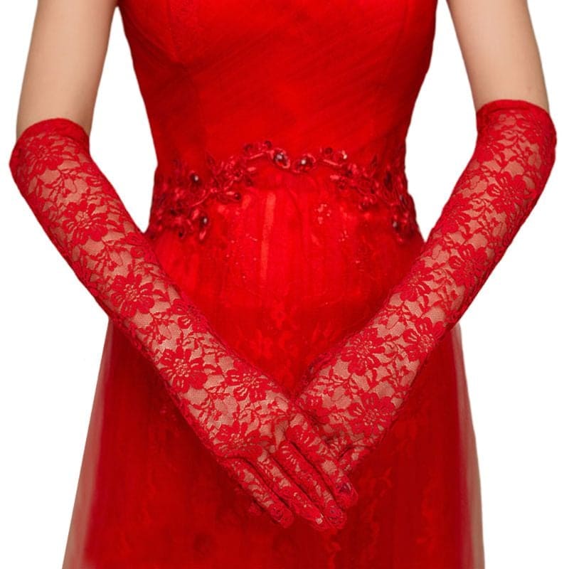 Găng tay Cô dâu và và Dạ hội, đi tiệc, sự kiện MS: 42734 Chất liệu: ren trong Kiểu dáng: kín ngón, trơn, dài ngang cổ tay Màu sắc: đỏ tươi. Đặc tính: Co giãn