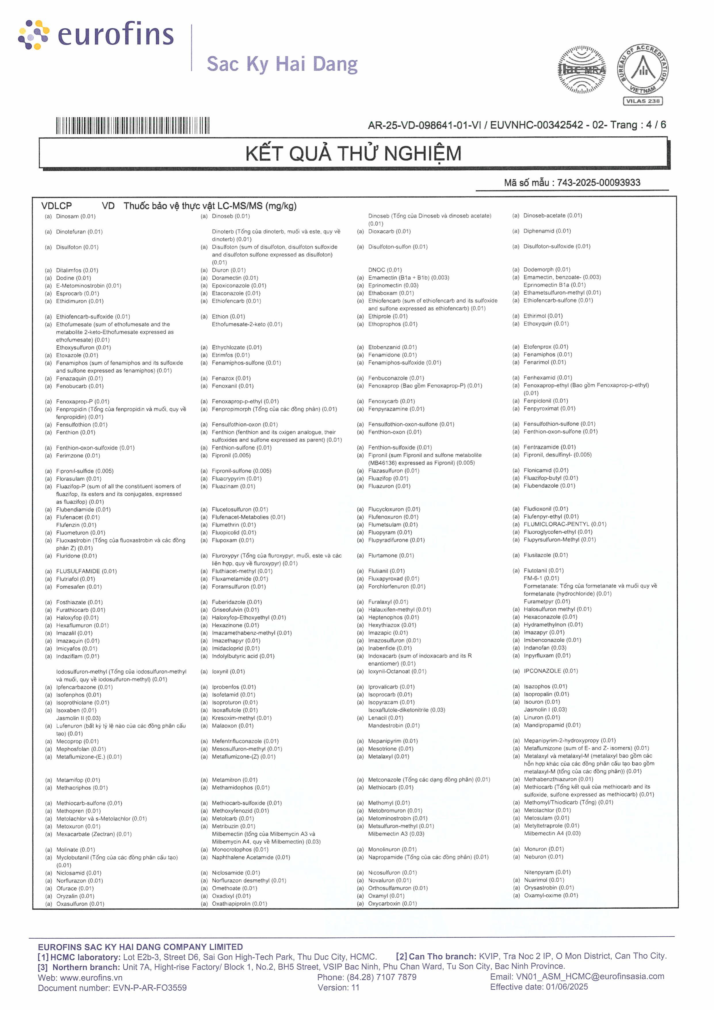- Đáp ứng các tiêu chuẩn về dư lượng thuốc bảo vệ thực vật, kim loại nặng và các chỉ tiêu an toàn thực phẩm khác của Liên minh Châu Âu (EU). (Kết quả thử nghiệm của Eurofin đính kèm)
