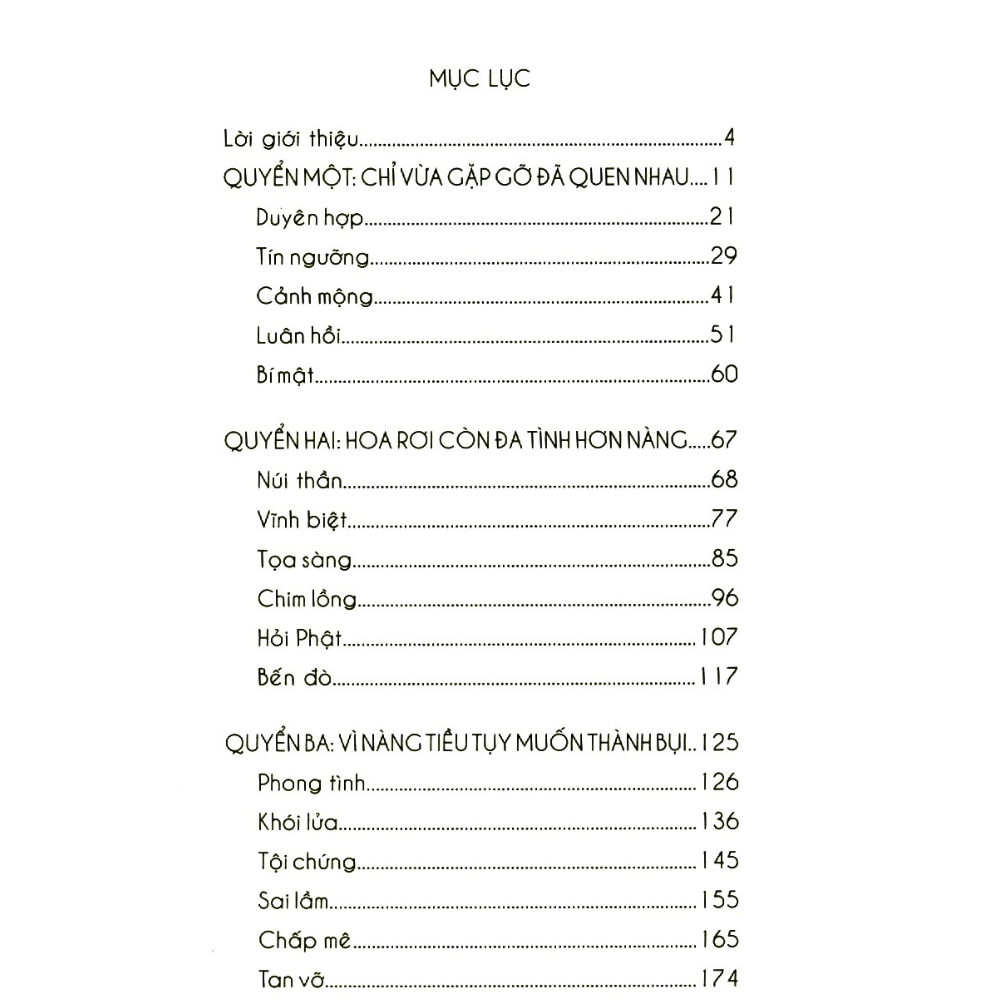 Gặp Lại Chốn Hồng Trần Sâu Nhất (Tái Bản) "Duyên là gì? Duyên là gặp nhau nơi ngã tư đường, là nắm tay chốn hồng trần xa lạ; duyên là muôn đóa hoa xuân đồng loạt nở rộ, là hai phiến lá thu cùng nhau rụng xuống; duyên là đối thoại giữa non và nước, là mặt trời và mặt trăng đồng thời xuất hiện. Gặp nhau, quen nhau giữa biển người mênh mông chính là duyên, lưu lạc giữa hồng trần lại không lãng quên chính là duyên. Gặp gỡ, là một kiếp nạn hạnh phúc, cũng là một nét đẹp sai lầm. Quên nhau, là một sự khởi đầu hoang mang, cũng là sự kết thúc trong trẻo." (Trích Duyên xưa)