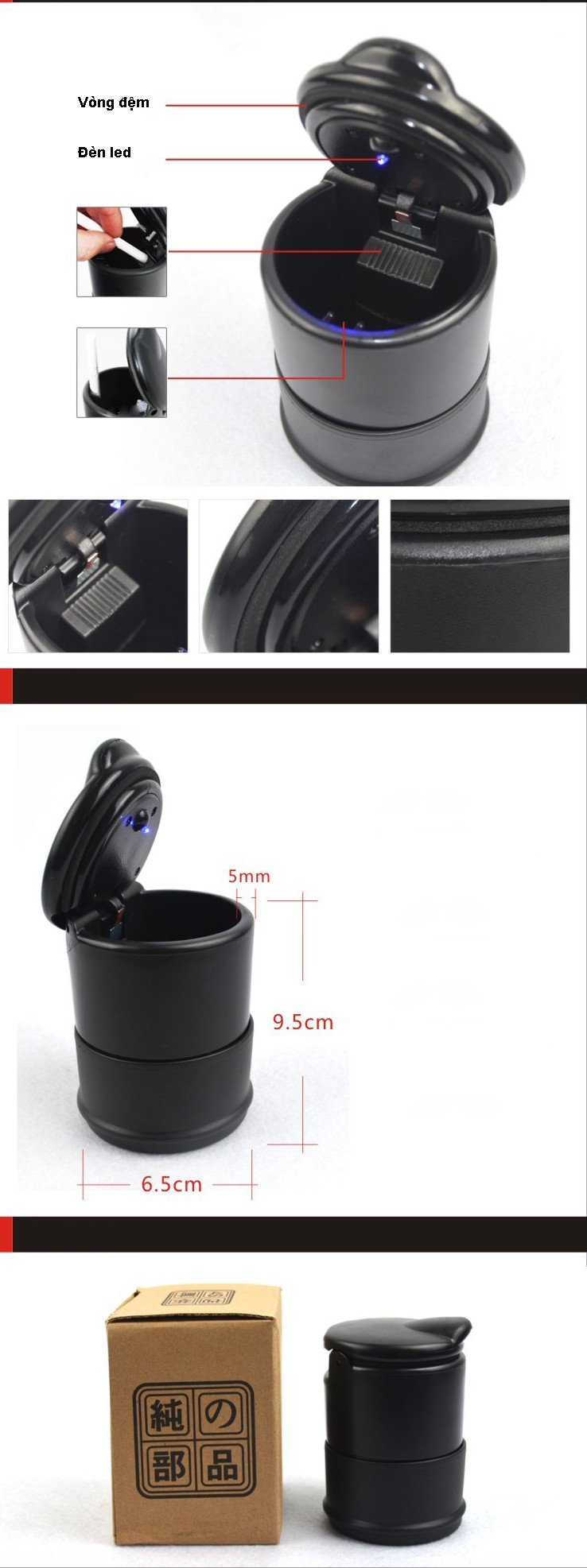 - Sản phẩm gạt tàn xe hơi cao cấpnổi bật với chất liệu nhựa ABS có sức chịu nhiệt độ cao, đèn led phát sáng. Với thiết kế vừa khít phần lớn khay giữ cốc trên mọi ô tô. Đèn led thông minh tự kích hoạt, phát sáng mày xanh khi mở nắp, an toàn sử dụng ngay cả trong đêm tối.