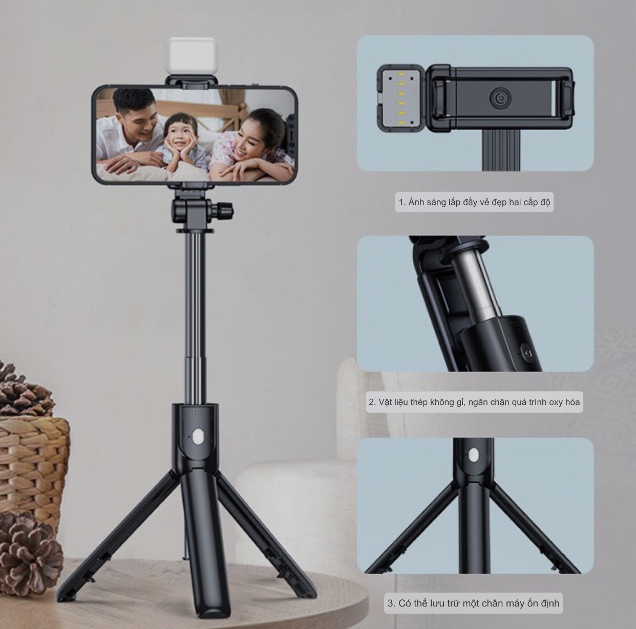 Gậy Selfie 3 Chân Kèm Đèn Trợ Sáng – Tự Sướng & Quay Video Đa Góc Độ Có Remote Bạn đang tìm kiếm một phụ kiện giúp chụp ảnh và quay video tiện lợi, chuyên