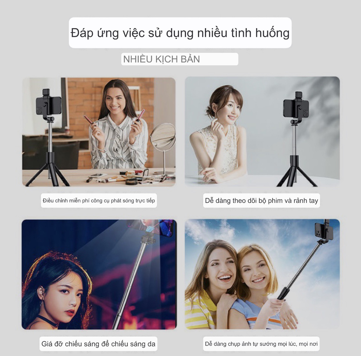 Gậy chụp ảnh quay video 3 chân có đèn led trợ sáng Gậy tự sướng selfie chụp hình bluetooth điều khiển từ xa xoay nhiều góc độ loại tốt Đặc điểm nổi bật: - Chụp ảnh bluetooth đến 10 mét - Gậy chụp ảnh 3 chân tripod tiện lợi - Xoay điện thoại ngang dọc linh hoạt - Gấp gọn, co dãn điều chỉnh điện thoại thông minh - Phù hợp nhiều loại điện thoại hiện nay Lưu ý : Bên shop có 2 phân loại gồm : Gậy có đèn và Gậy không đèn ( Qúy khách đặt hàng chú ý chọn đúng phân loại cần mua ạ ) Chi tiết sản phẩm: 1. Loại có đèn led trợ sáng (bản nâng cấp): - Có điều khiển blueetooth, có xoay được điện thoại ngang, dọc, gập lên gập xuống - Có đèn led trợ sáng sạc điện (đã kèm sạc USB) - Với ưu điểm có đèn sẽ giúp bạn tăng sáng cho bức ảnh hoặc video bạn quay có độ sáng hơn và đẹp hơn hẳn - Màu sắc: Đen - Chất liệu: nhựa ABS+ inox - Pin: Cr1632 - Kích thước: chiều dài tối đa đạt 100cm - Điều khiển: sử dụng remote Bluetooth điều khiển từ xa khoảng cách lên đến 10 mét 2. Loại thường (không có đèn trợ sáng): - Có điều khiển blueetooth, có xoay được điện thoại ngang, dọc, chốt vặn gập lên xuống - Màu sắc: Đen - Chất liệu: nhựa ABS+ inox - Pin: Cr1632 - Kích thước: chiều dài tối đa đạt 100cm - Điều khiển: sử dụng remote Bluetooth điều khiển từ xa khoảng cách lên đến 10 mét 4. Gậy chụp ảnh XT-02 - Mã : XT02 - Có điều khiển blueetooth, có xoay được điện thoại ngang, dọc, gập lên gập xuống - Chất liệu: nhựa ABS+ inox - Màu sắc: Đen - Pin: Cr1632 - Kích thước: chiều dài tối đa đạt 80cm