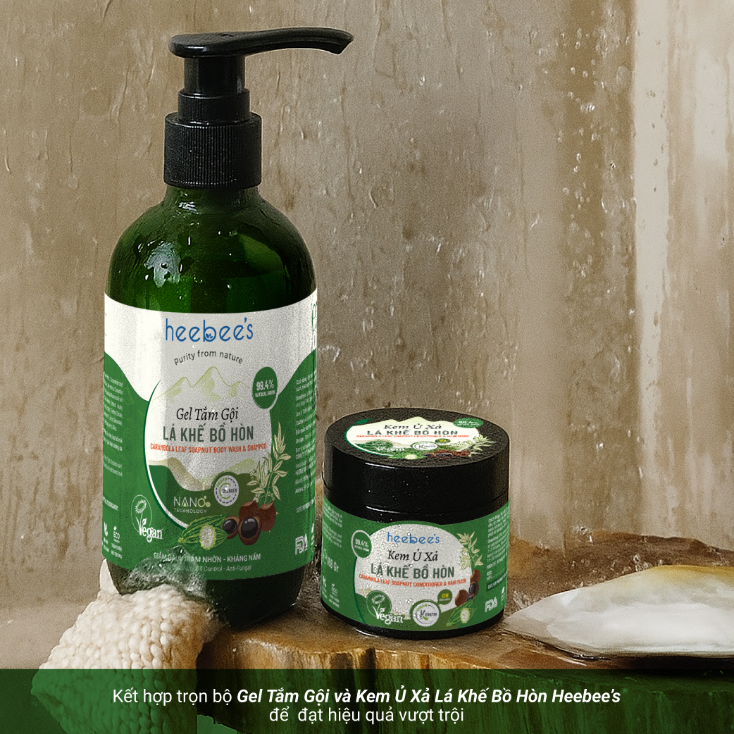 GEL TẮM GỘI LÁ KHẾ BỒ HÒN HEEBEE'S GIẢM GÀU, GIẢM NHỜN, KHÁNG NẤM 300ML - 500ML ĐIỂM NỔI BẬT Gel Tắm Gội Lá Khế Bồ Hòn 2in1 – giải pháp “Sạch sâu - Dưỡng sâu” thuần chay từ Lab Heebee, thiết kế riêng cho làn da nhạy cảm, đang gặp vấn đề như nấm, viêm da cơ địa, mụn hay rôm sảy. Kết hợp hệ chiết xuất thảo dược giàu tính Đông Y (Bồ Hòn, Lá Khế, Khổ Qua Rừng), công nghệ GreenSoap & Green-Antibiotic, cùng Collagen Nấm Tuyết & Vitamin B5 trên nền nước Hydrosol Vetiver tinh khiết. Sản phẩm không chỉ làm sạch sâu và lành tính mà còn tái tạo hàng rào bảo vệ da – cân bằng hệ vi sinh, giảm ngứa, bong tróc và khô sần. An toàn cho cả gia đình – từ mẹ bầu đến trẻ nhỏ, hướng đến lối sống “Thuần Xanh – Chuẩn Lành” bền vững từ bên trong. THÀNH PHẦN CHÍNH ĐIỀU GÌ KHIẾN GEL TẮM GỘI LÁ KHẾ BỒ HÒN HEEBEE'S KHÁC BIỆT? CAM KẾT SẢN PHẨM CÔNG DỤNG ‣ Làm sạch sâu, không khô căng, không kích ứng – loại bỏ bụi bẩn, dầu thừa, mùi cơ thể và vi khuẩn gây viêm da ‣ Kháng khuẩn – kháng nấm – giảm ngứa rõ rệt – hỗ trợ cải thiện tình trạng mẩn đỏ, gàu, nấm, viêm da cơ địa, vảy nến ‣ Nuôi dưỡng da đầu khỏe mạnh, giảm gãy rụng, kích thích mọc tóc ‣ Dưỡng ẩm, làm mềm, củng cố hàng rào bảo vệ tự nhiên của da ĐỐI TƯỢNG SỬ DỤNG ‣ Phù hợp cho mọi loại da, tóc, lứa tuổi và giới tính ‣ Dịu nhẹ với da nhạy cảm, da khô sần, da dầu nhờn hay dễ kích ứng ‣ Thích hợp cho tóc mỏng yếu, hư tổn, da đầu gàu, nhờn, dễ bết ‣ An toàn cho phụ nữ mang thai, sau sinh, trẻ nhỏ và người có bệnh lý mãn tính cần sản phẩm chăm sóc thuần tự nhiên mỗi ngày ‣ Đặc biệt phù hợp với người đang gặp các vấn đề da liễu như viêm da, vảy nến, mụn, rôm sẩy, cần giải pháp sạch lành – không hóa chất gây hại CÁCH SỬ DỤNG Gội đầu: ‣ Làm ướt tóc, tạo bọt sản phẩm với nước rồi thoa đều lên tóc và da đầu. ‣ Massage nhẹ nhàng từ gốc đến ngọn trong 2–3 phút để làm sạch và nuôi dưỡng sâu, sau đó xả sạch. ‣ Với tóc dày, tóc dài, nhiều dầu hoặc đang gặp vấn đề da đầu, nên lặp lại bước gội 2–3 lần để đạt hiệu quả tối ưu. Tắm cơ thể: