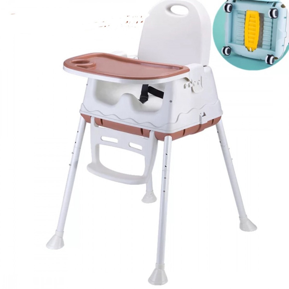 Ghế ăn dặm có trang bị 4 bánh xe , nó giúp biến chiếc ghế trở thành chiếc xe đồ chơi cho bé hoặc xe tập đi cho bé.