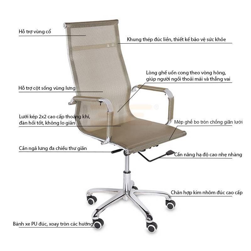 Đặc điểm nổi bật Thiết kế công thái học: hỗ trợ cột sống, giảm đau mỏi lưng – cổ khi ngồi lâu. Lưng lưới thoáng khí: ngồi thoải mái, không nóng lưng. Đệm mút bọc