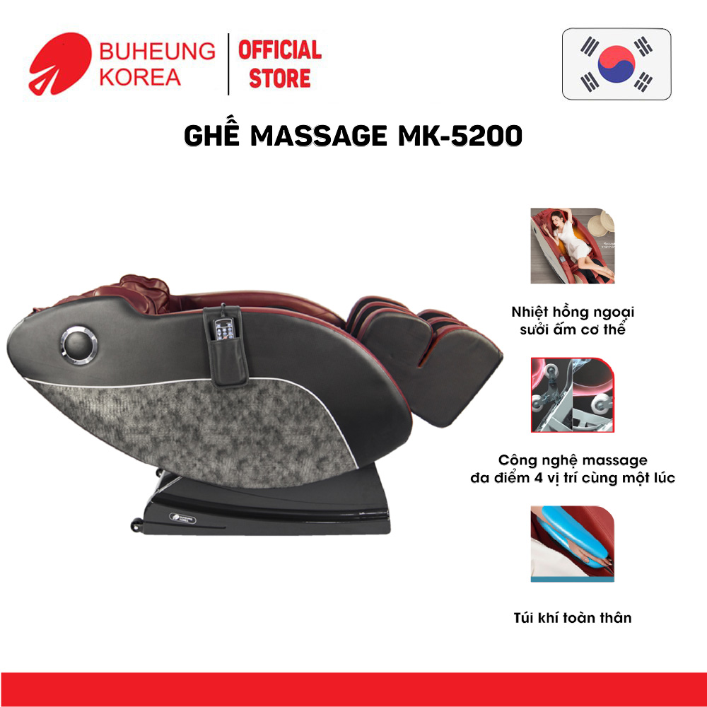 Cấu tạo của ghế massage toàn thân MK-5200Ghế massage Buheung MK-5200 phù hợp với nhiều đối tượng, từ người già đến người trẻ, cả những thanh thiếu niên hay chơi thể thao. Ghế massage mang lại nhiều công dụng cho người nằm như tăng lưu thông máu huyết, ổn định huyết áp, tăng sức đề kháng, giảm đau,… là một thiết bị chăm sóc sức khỏe cho cả gia đình.