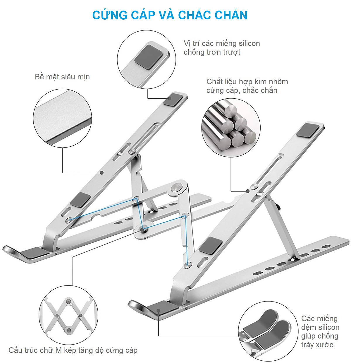 - Chất liệu hợp kim nhôm không gỉ, siêu vững, không gây kích ứng da - Thiết kế siêu mỏng, gọn, nhẹ, dán luôn ở mặt đáy của laptop, khi sử dụng chỉ cần gạt