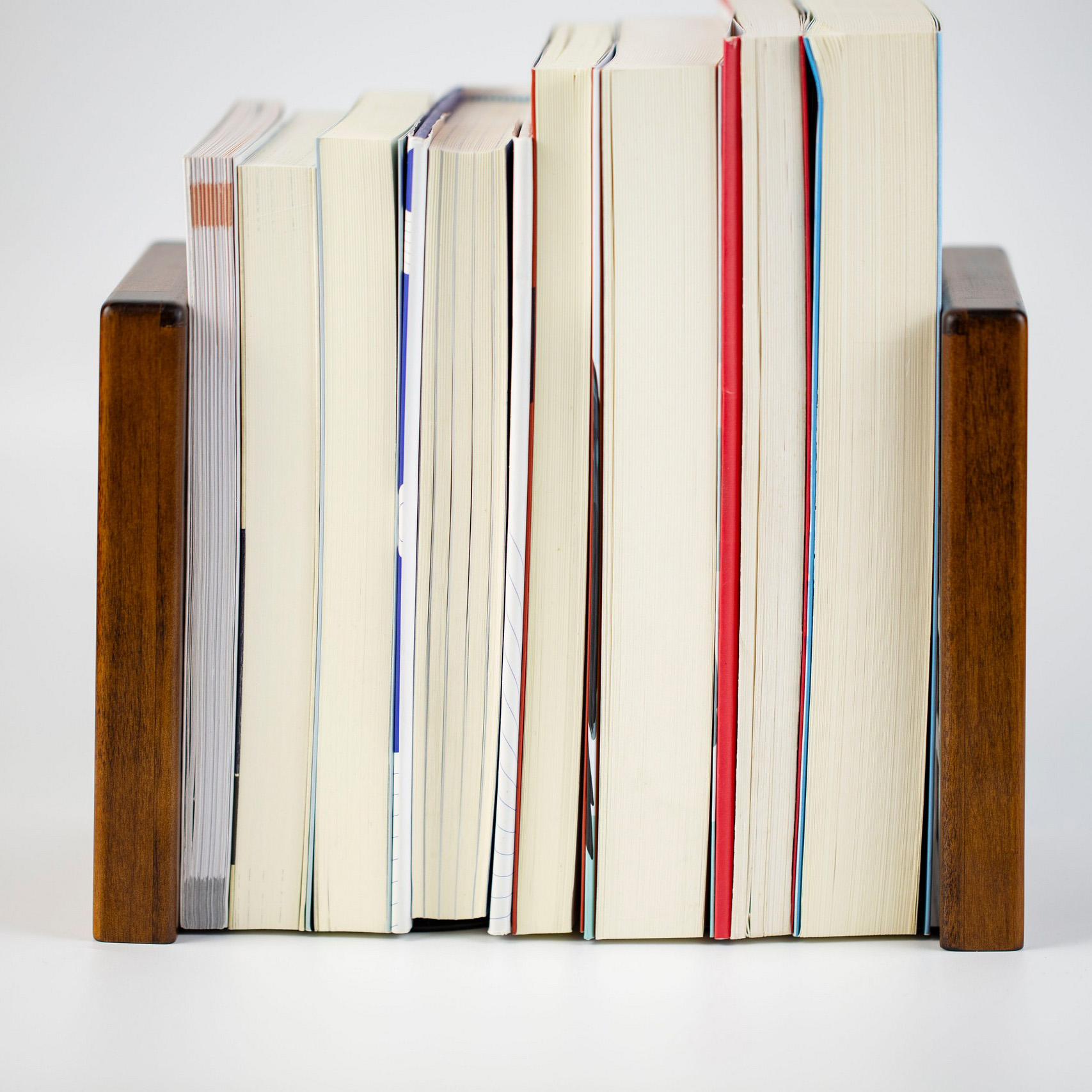 Sách dựng đứng được chèn từ 2 bên bởi hai tấm lưới gỗ.