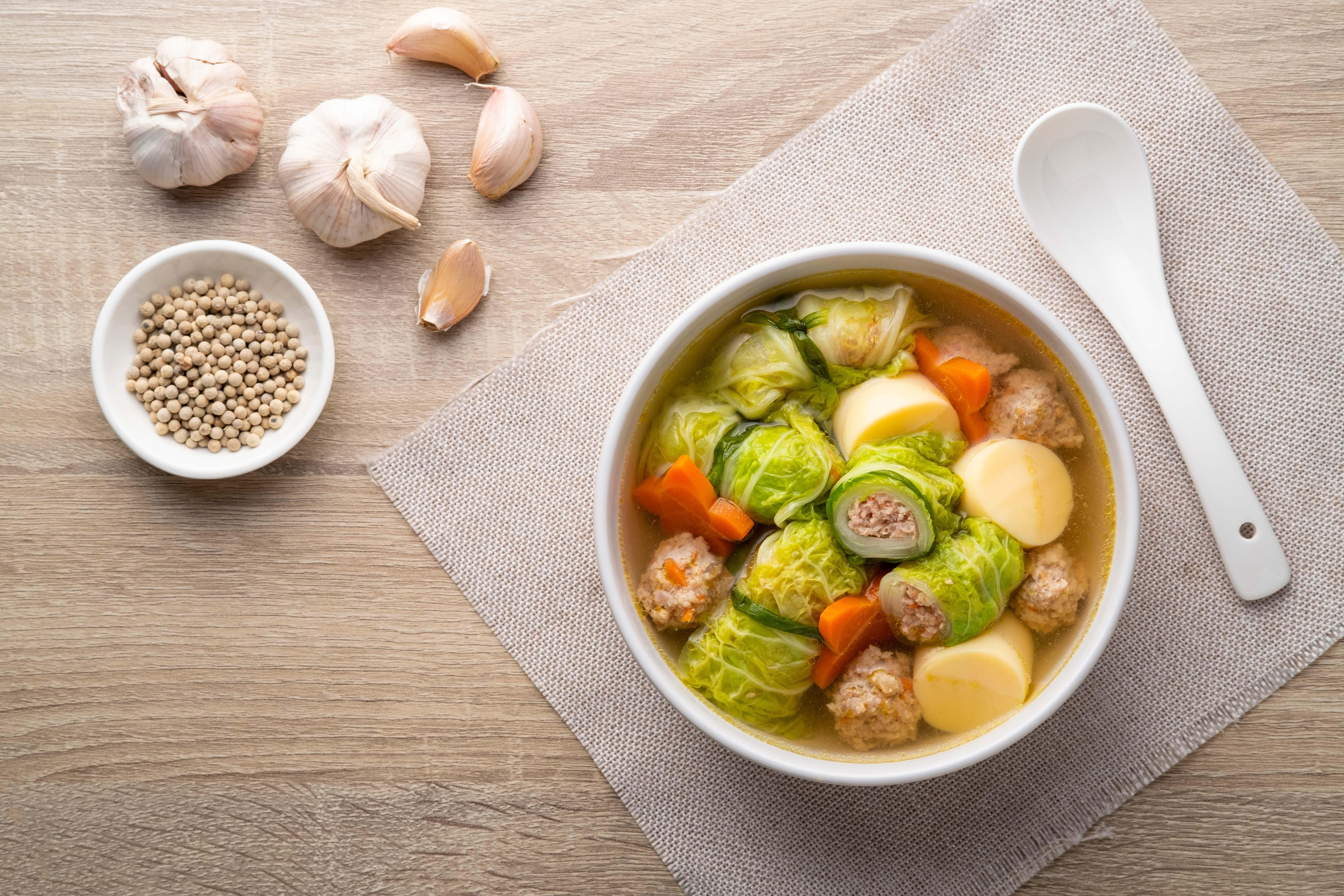 canh, thịt băm xào lá quế, trứng chiên thịt băm.