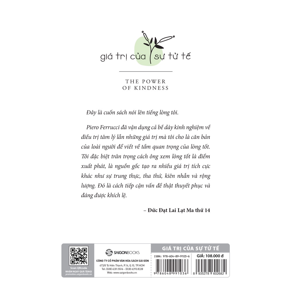 Việc cố gắng tạo ra điều gì đó tích cực trong cuộc sống là điều vô cùng quan trọng. Chúng ta không được sinh ra để gây rắc rối và làm hại người khác. Như Piero Ferrucci đã trình bày một cách đầy đủ và mạch lạc trong cuốn sách Giá trị của sự tử tế này, để cuộc sống thật sự có giá trị, ta cần củng cố và nuôi dưỡng những giá trị cơ bản của con người như sự nhiệt thành, lòng tốt và sự đồng cảm. Nếu làm được điều đó, cuộc sống của chúng ta sẽ trở nên có ý nghĩa, hạnh phúc và bình an hơn, đồng thời sẽ góp một phần tích cực vào thế giới quanh mình.