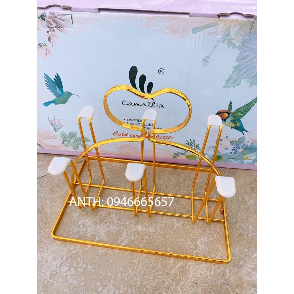 Khay úp cốc 6 chiếc hình gấu mạ vàng, có ống sứ cắm thìa dĩa Giá úp ly, úp cốc mạ vàng kèm ly sứ men xanh đựng dĩa thìa Giá úp có 6 cột