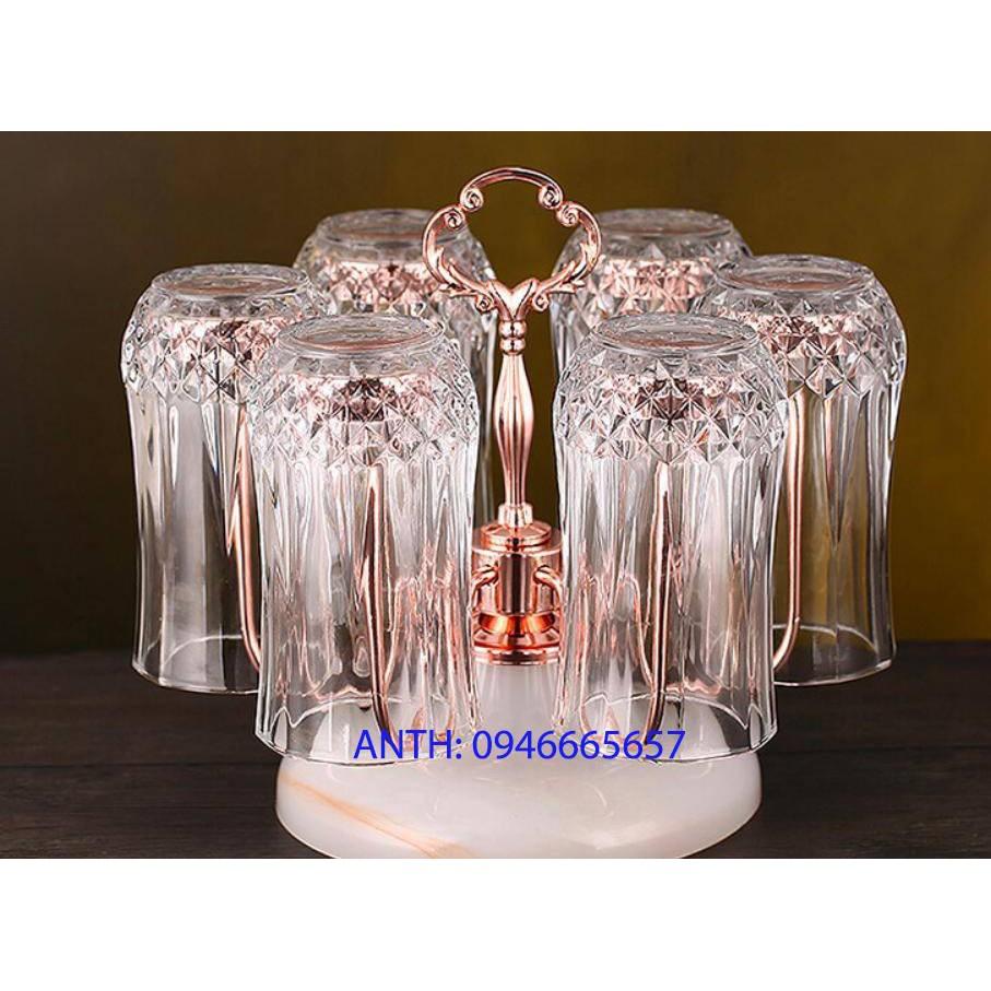 Giá úp cốc 6 chiếc trụ inox màu vàng hồng đế đá Giá cắm 6 chiếc cốc dạng gọn Giá có khay hứng nước Chất liệu sắt sơn tĩnh điện cao cấp màu vàng cực