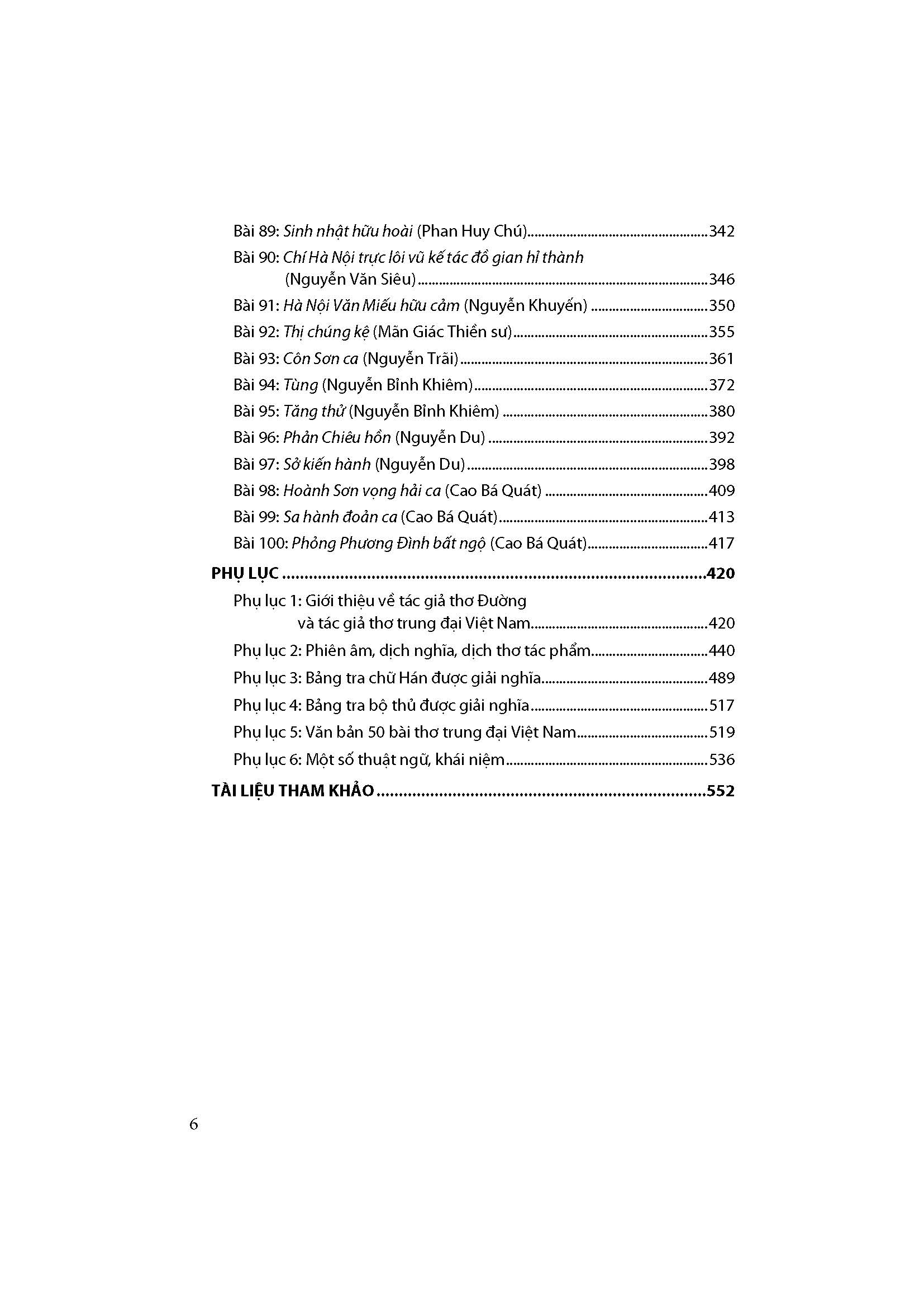 Bên cạnh đó, các Phụ lục trong cuốn sách này sẽ giúp bạn đọc tra cứu thêm các chữ Hán chưa được giải nghĩa trong từng bài thơ; tìm hiểu thêm về bộ thủ cũng như phần phiên âm, dịch nghĩa 100 bài thơ và bản dịch 50 bài thơ Đường; chỉ dẫn cách tra cứu khoảng 1500 chữ Hán được giải nghĩa trong cuốn sách, mỗi chữ Hán xuất hiện trong một ngữ cảnh cụ thể của tác phẩm.