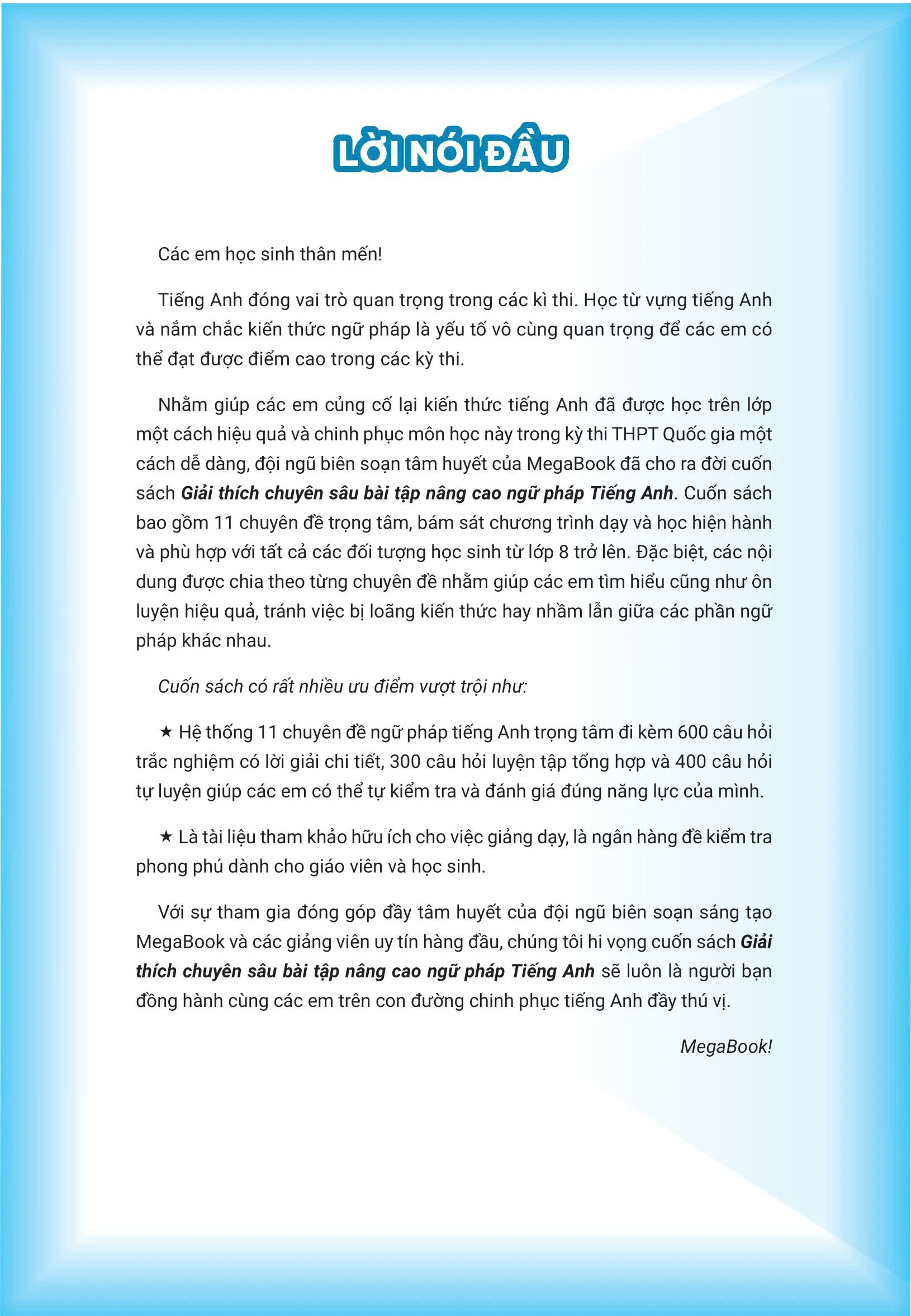 Cuốn sách bao gồm 11 chuyên đề ngữ pháp tiếng Anh trọng tâm, giúp các em học sinh có cơ hội củng cố và nâng cao kiến thức ngữ pháp một cách hiệu quả. Các bài tập trong cuốn sách được thiết kế cẩn thận và kèm theo lời giải chi tiết, giúp học sinh hiểu rõ cách giải quyết và học từ các bài tập.