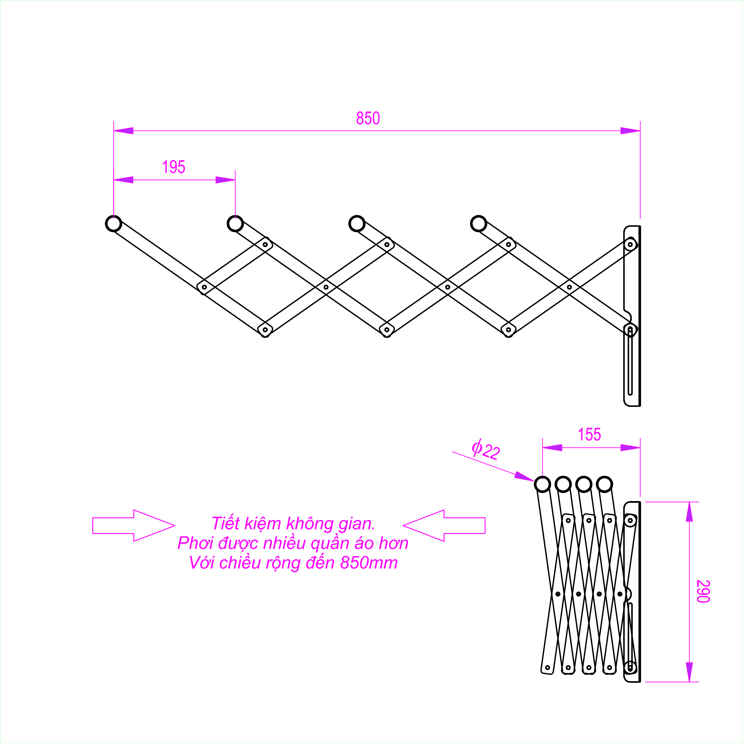 - Kích thước: Dài 120cm; khi bung ra rộng 85cm; đóng lại rộng 15.5cm - Các ống inox lớn, đường kính đến 22mm, dày 0.6mm, cam kết cho bạn treo đồ thỏai mái > 50kg