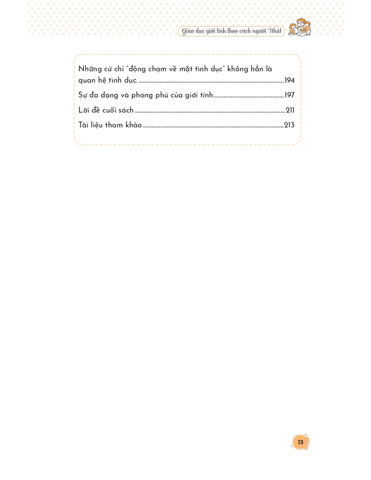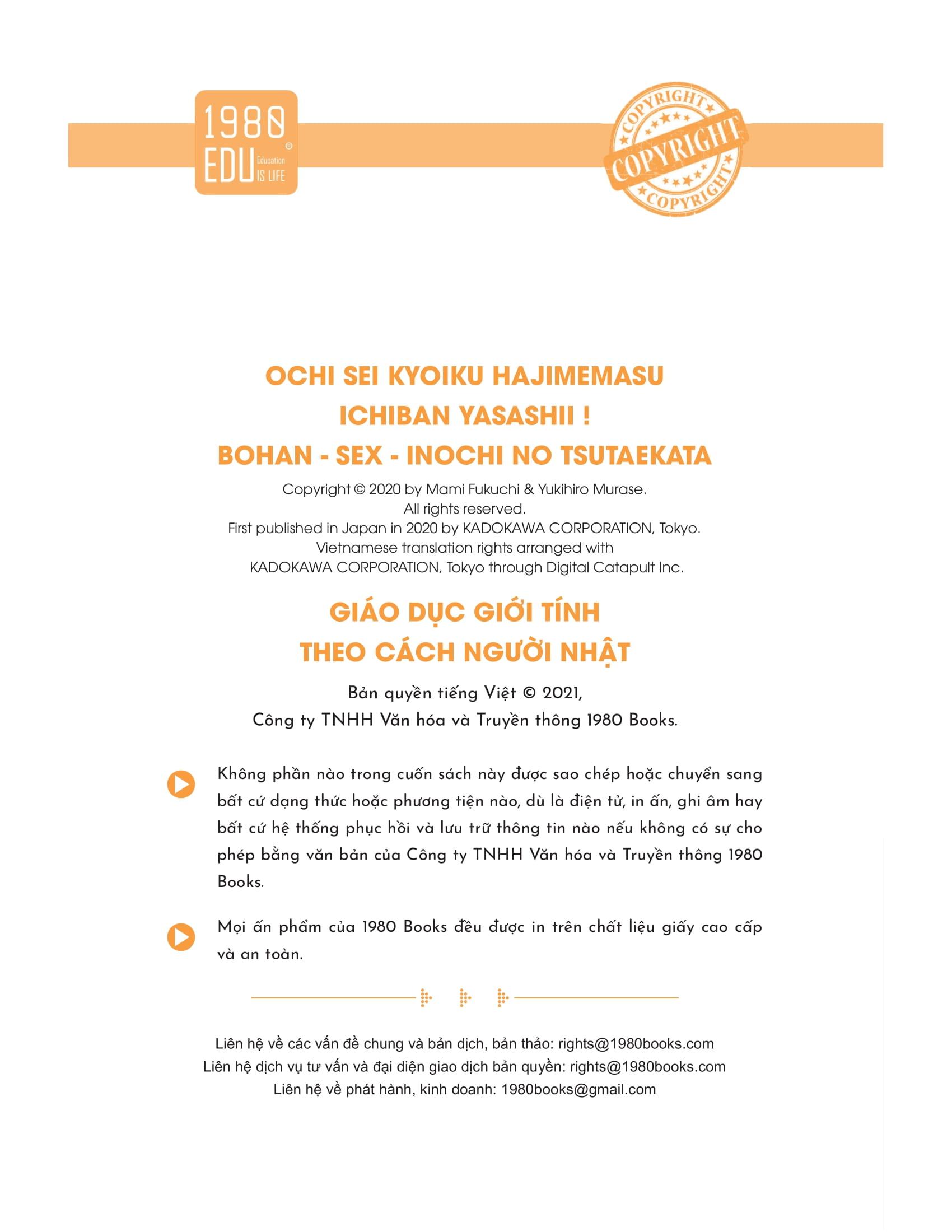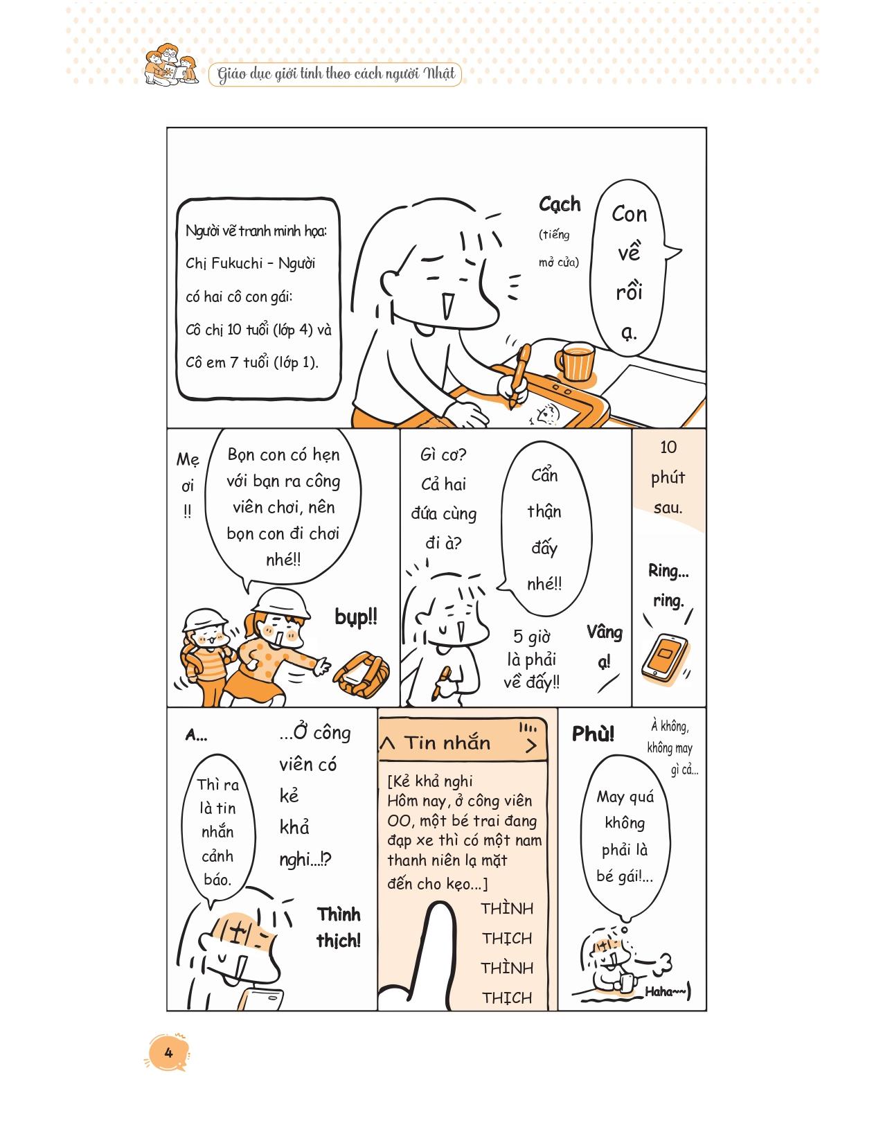 “Giáo dục giới tính theo cách người Nhật” là cuốn truyện tranh về giáo dục giới tính hữu ích giúp cha mẹ và các con có thêm kiến thức và hiểu hơn về tầm quan trọng của việc giáo dục giới tính cho con ngay từ sớm. Cuốn sách là những câu chuyện thú vị và sinh động mà nhiều phụ huynh và các bạn nhỏ gặp phải trong cuộc sống hàng ngày, trong mỗi gia đình. Mỗi câu hỏi và vấn đề được đưa ra đều được nhân vật Bác sĩ Thỏ tư vấn và giải thích giúp các bậc cha mẹ hiểu và nắm bắt được các thông tin để giúp bảo vệ con khỏi các vấn đề liên quan tới xâm hại tình dục hay những thông tin xấu trên mạng.