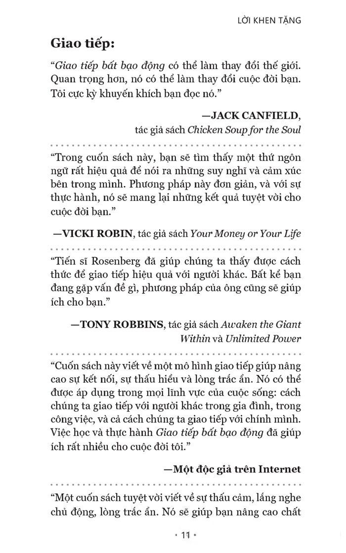 Nói ngắn gọn, Giao tiếp bất bạo động là ngôn ngữ của lòng trắc ẩn nhằm giúp bạn cải thiện khả năng giao tiếp và chất lượng mối quan hệ với bản thân và với người khác. Trong cuốn sách này, bạn sẽ học cách nhận biết những suy nghĩ, cảm xúc, nhu cầu của bản thân, và bày tỏ chúng với sự chân thành và tôn trọng. Đồng thời, bạn cũng sẽ học cách lắng nghe những cảm xúc và nhu cầu đằng sau mọi thông điệp của người khác, dù cho những thông điệp đó có khó nghe như thế nào đi nữa. Từ đó, bạn có thể cùng người khác giải quyết những bất đồng, mâu thuẫn một cách hiệu quả hơn rất nhiều.